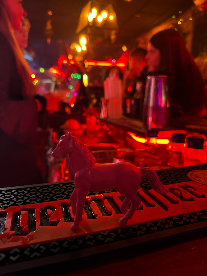 In a dimly lit, blurry setting, a plastic pink pony is perched on a decorative object. The object is tan with dark accents and a geometric pattern, possibly part of a larger structure. Red lighting do…read more