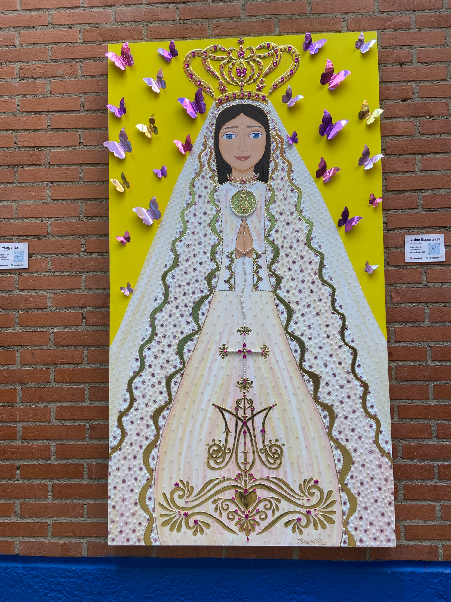 The image shows a painting of a woman with a crown and ornate robe, adorned with butterflies, hanging on a brick wall. Two business cards or tags are attached to the painting. The painting has a yello…read more