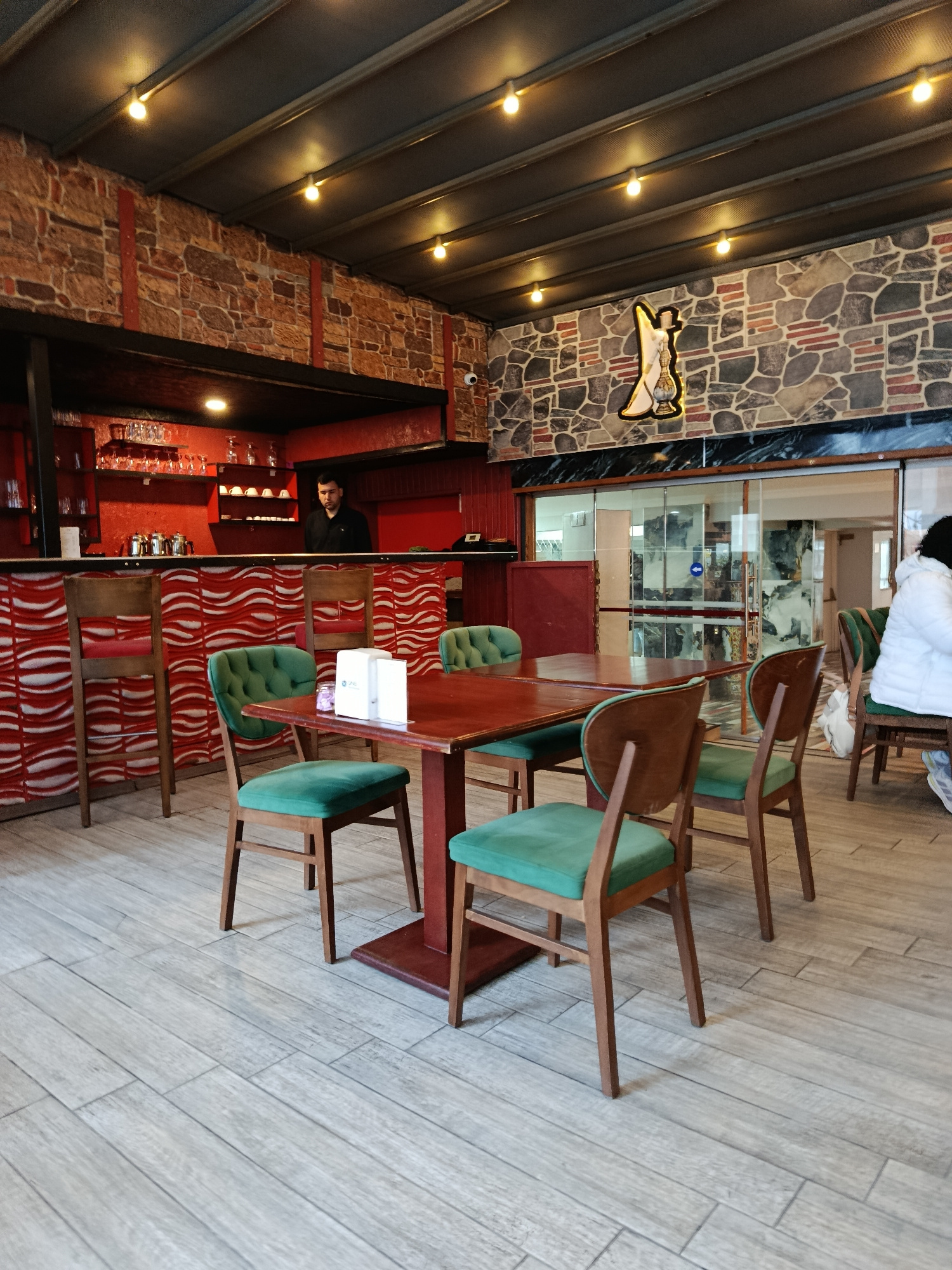 The image depicts the interior of a restaurant or cafe, possibly in Istanbul, Turkey. The scene features a table with four green upholstered chairs, positioned centrally on a light gray, wood-patterne…read more