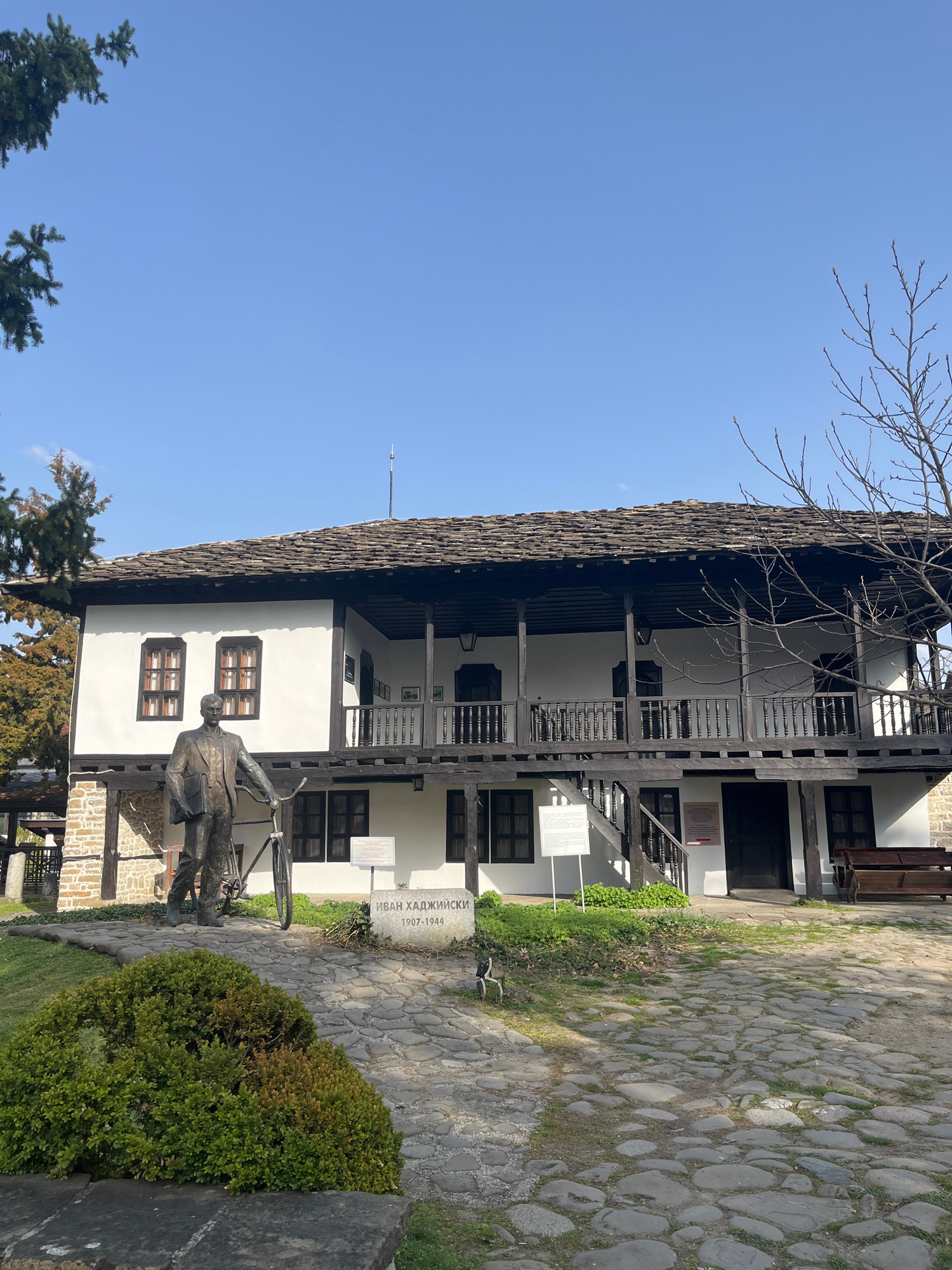 The image shows the Ivan Hadzhiyski House Museum in Troyan, Bulgaria. The building is a traditional Balkan house with a white façade, dark wood trim, and a stone roof. A statue of Ivan Hadzhiyski stan…read more