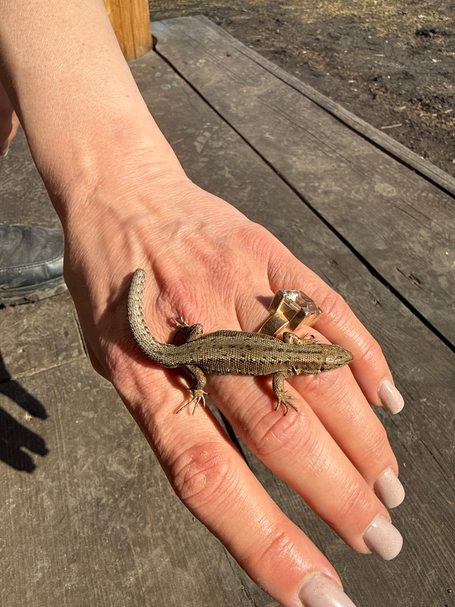 A person's hand is displayed, with a brown lizard resting on the palm. The hand is fair-skinned and adorned with a large, square ring on the ring finger. The lizard is brown with darker markings along…read more