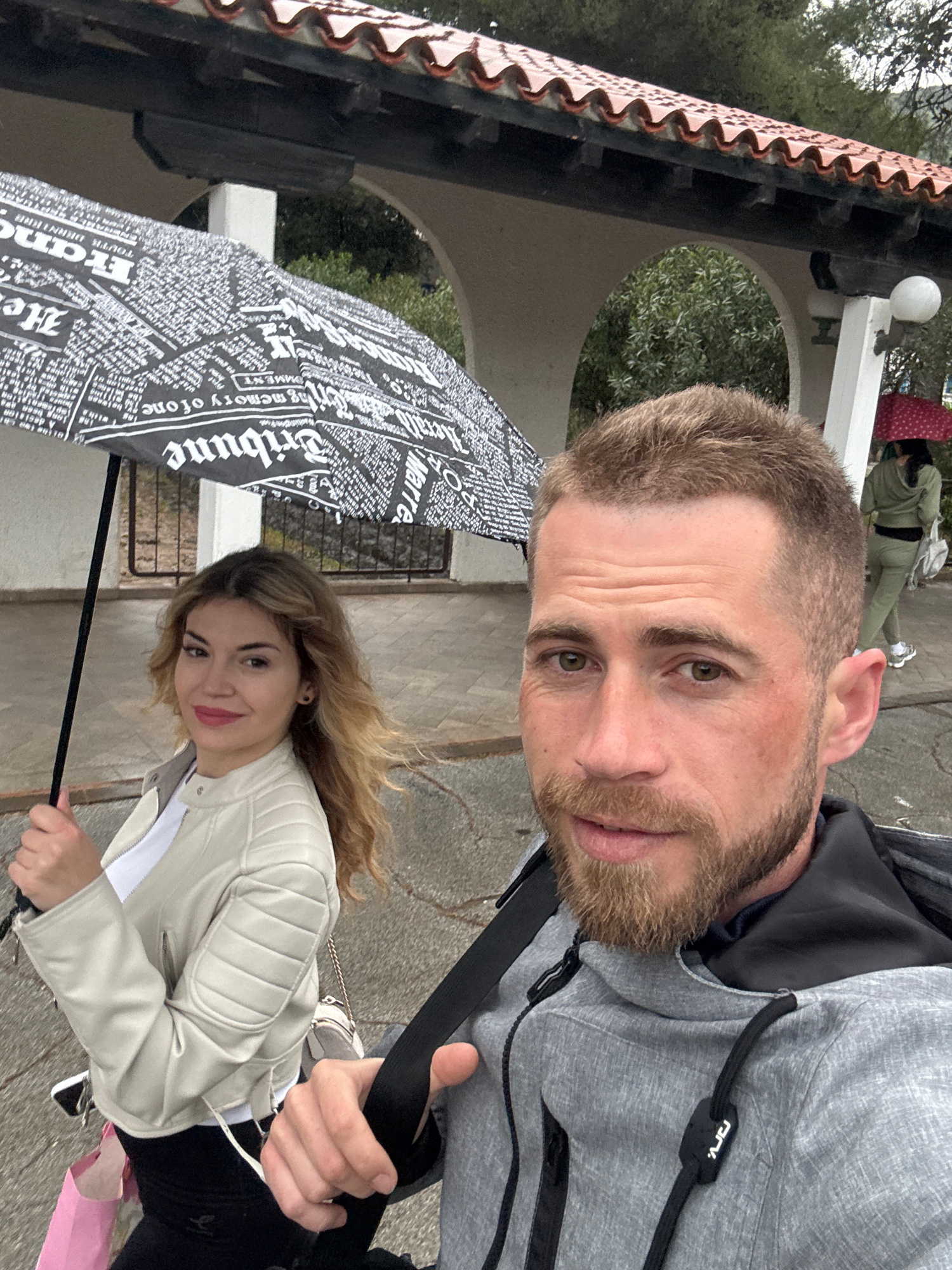 The image is a selfie taken by a man outdoors, with a woman beside him under an umbrella. The man has short brown hair, a beard, and is wearing a gray hooded jacket. The woman has long blonde hair and…read more
