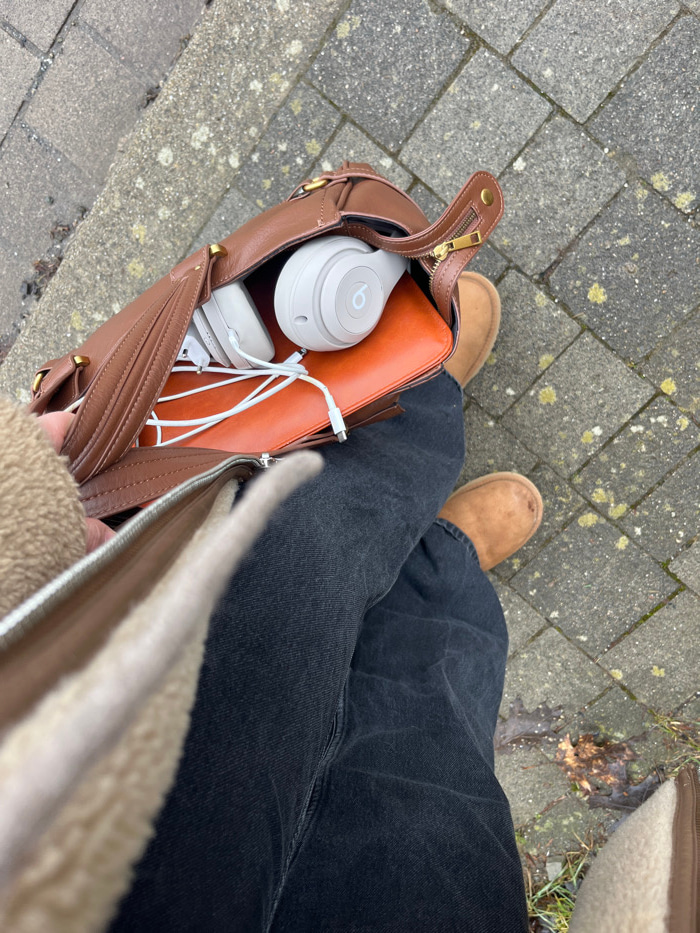 The image depicts a top-down view of an individual standing or seated outdoors in Gangloff, Germany. The subject is wearing dark grey jeans and tan, Ugg-style boots. A light brown, possibly sherpa-lin…read more