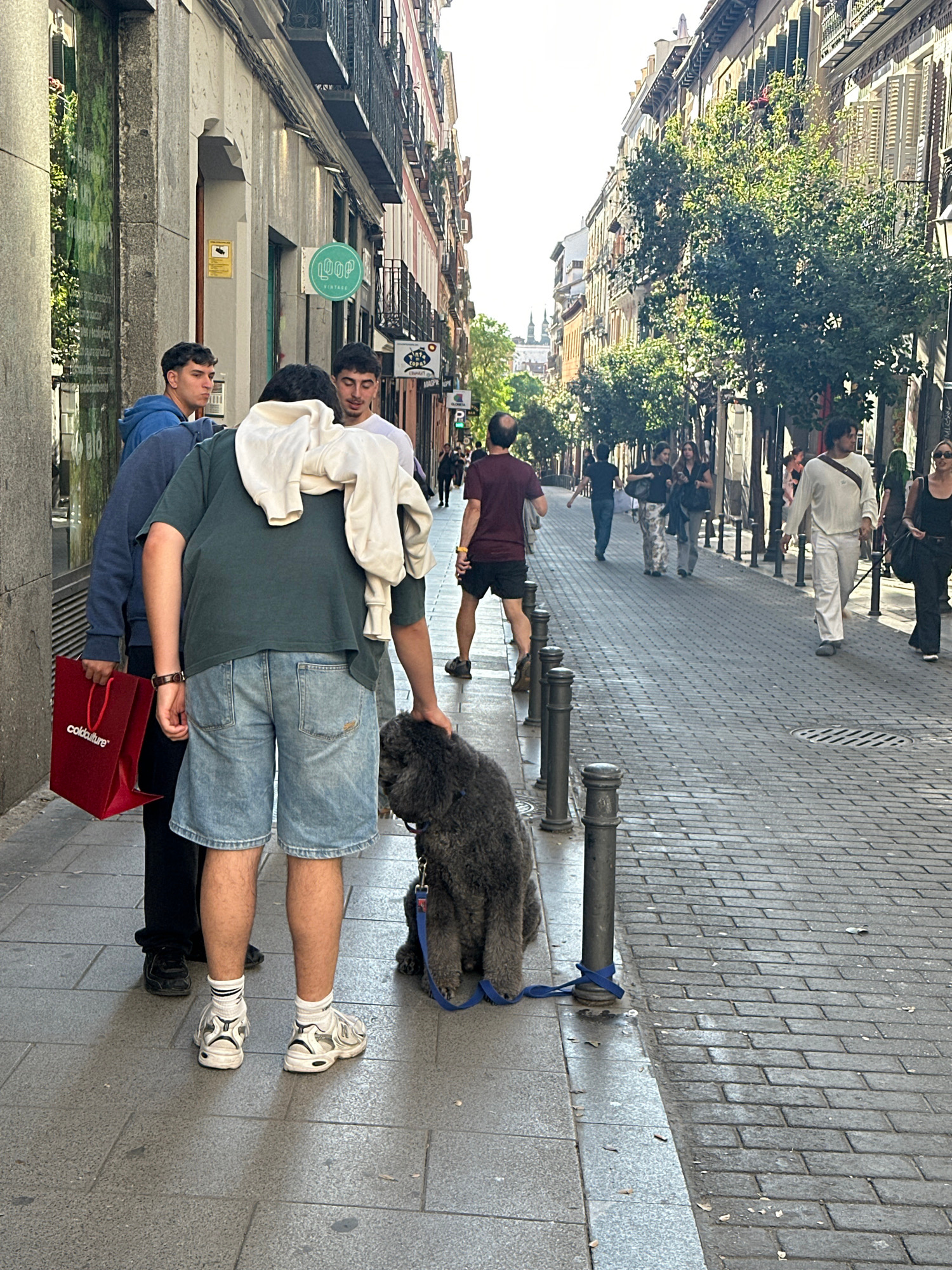 The image shows a street scene in Madrid, Spain. The street is paved with rectangular gray stones and lined with metal bollards. Buildings with multiple stories and balconies are visible along the str…read more