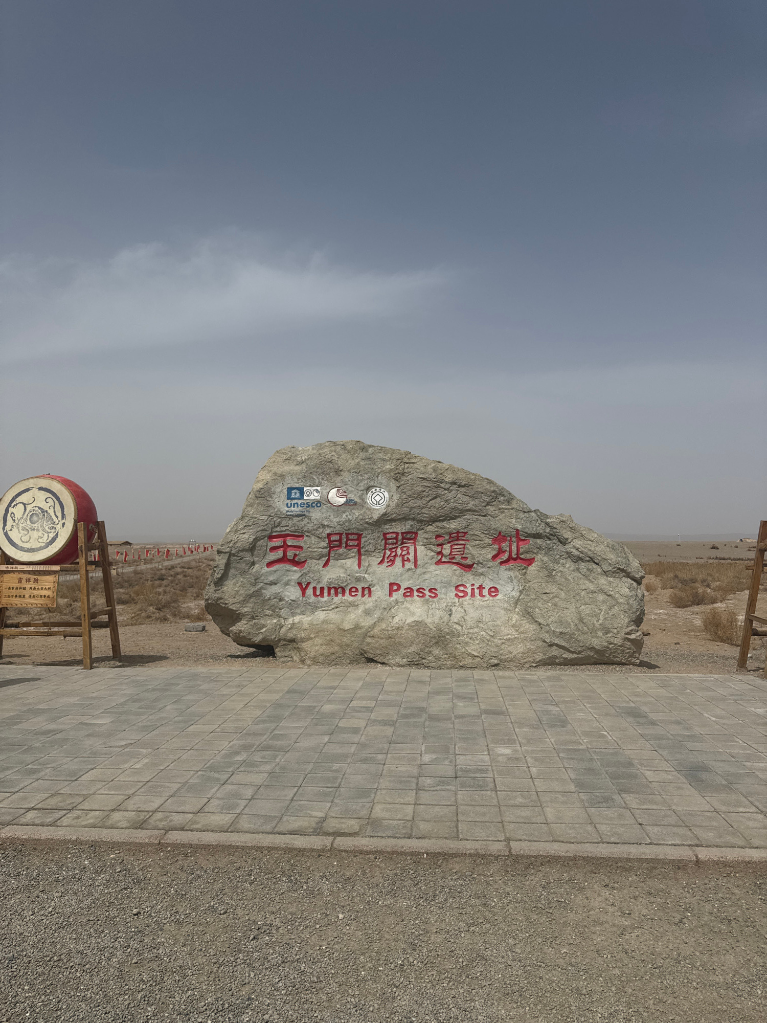 The image, taken at the Yumen Pass Site near Dunhuang City, China, showcases a prominent stone monument and a traditional drum at what appears to be a historical or cultural landmark. In the center o…read more