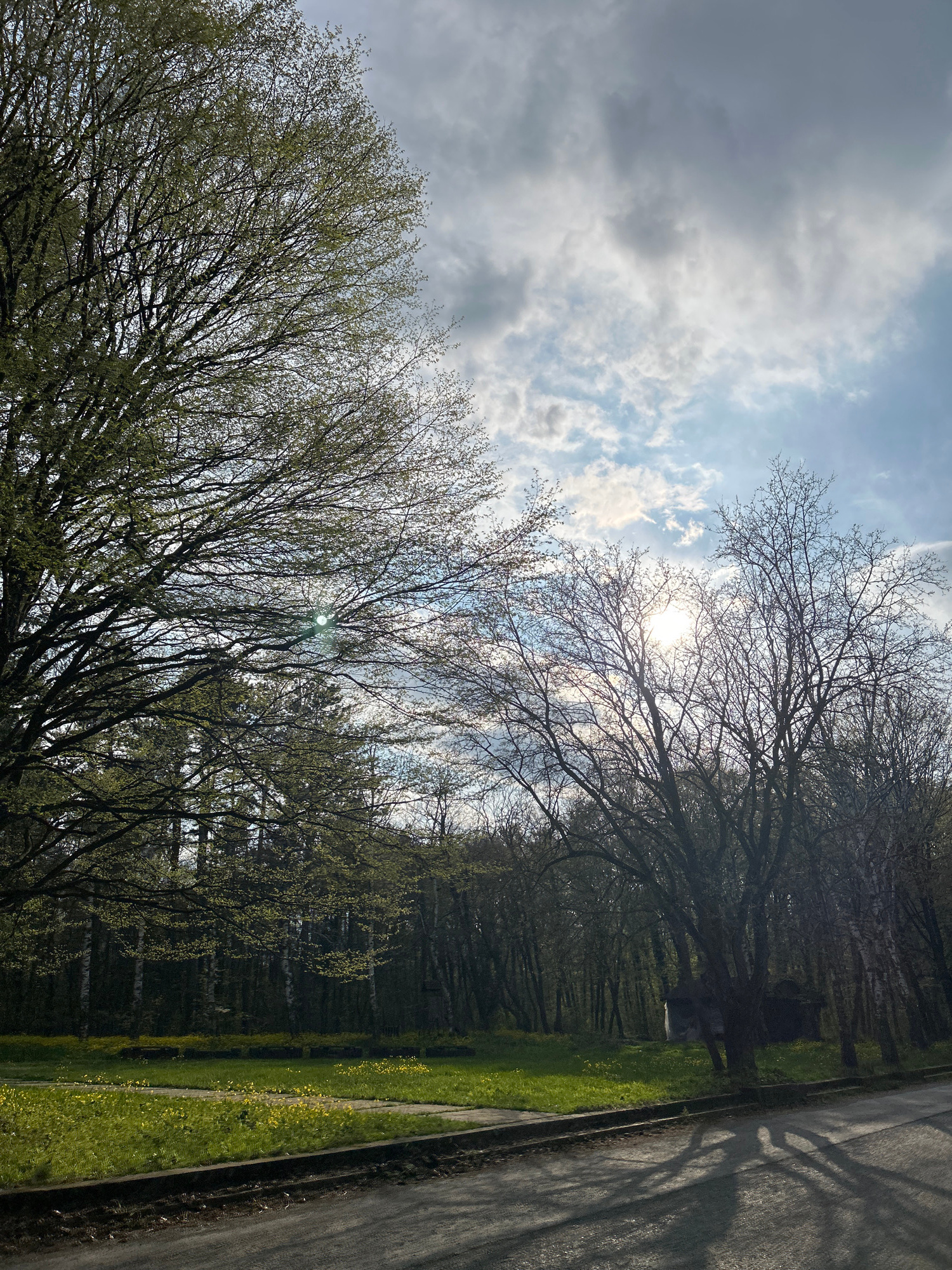 The image captures an outdoor scene dominated by a vibrant spring landscape under a partly cloudy sky. The bright sun is visible in the upper central portion of the frame, partially obscured by tree b…read more