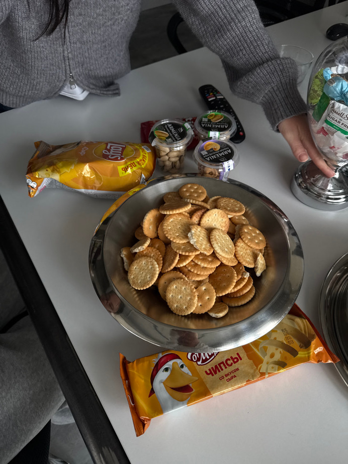 The image depicts a static, slightly elevated view of a white table surface in an interior location within Yerevan, Armenia. Two individuals are partially visible. On the left, a person's torso and u…read more