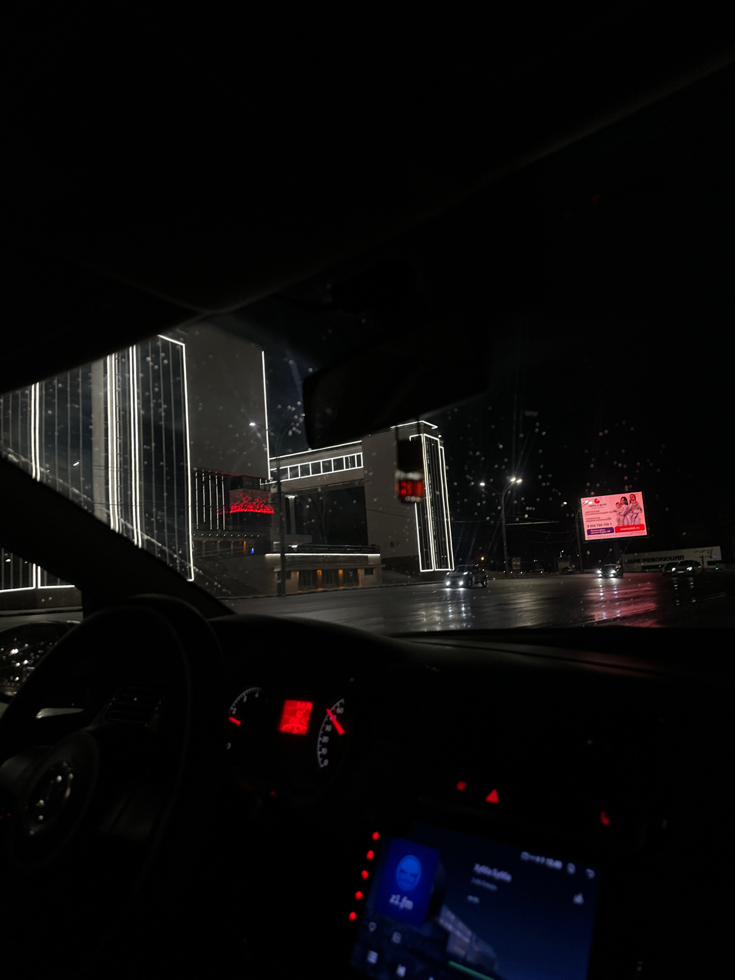 The image appears to be taken from inside a car at night, likely on a rainy night as indicated by the water droplets on the windshield. The vehicle's dashboard is visible. Outside, there's a modern-lo…read more