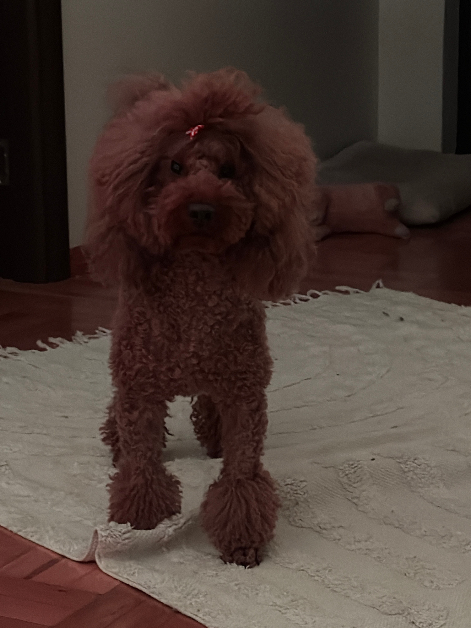 A small, brown poodle with a red hair accessory is standing on a white, textured rug with a fringed edge. The rug is positioned on a brown wooden floor. In the background, there is a gray sofa and a d…read more