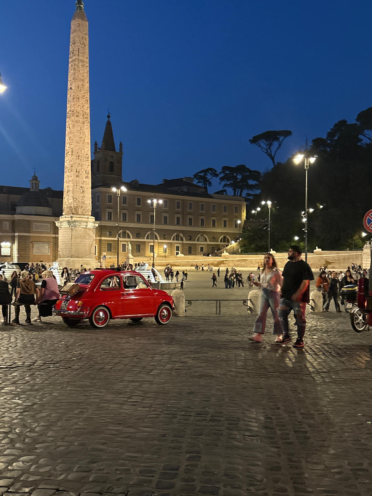 The image depicts Piazza del Popolo in Rome, Italy, during the evening. A tall obelisk stands prominently against a deep blue sky. Buildings are visible in the background, illuminated by streetlights.…read more