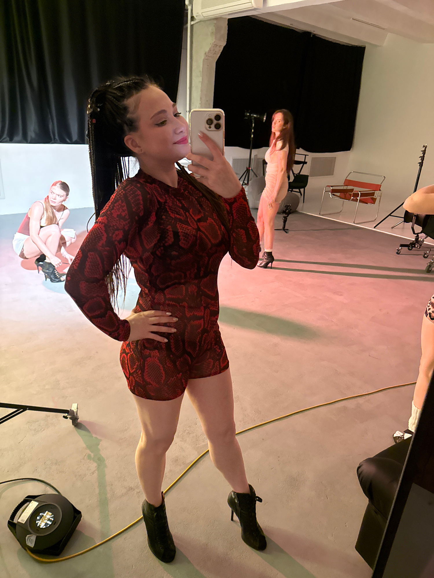The image shows a woman in a red patterned dress and black boots taking a selfie in what appears to be a photography studio. Other individuals are seen in the background and reflected in a large mirro…read more