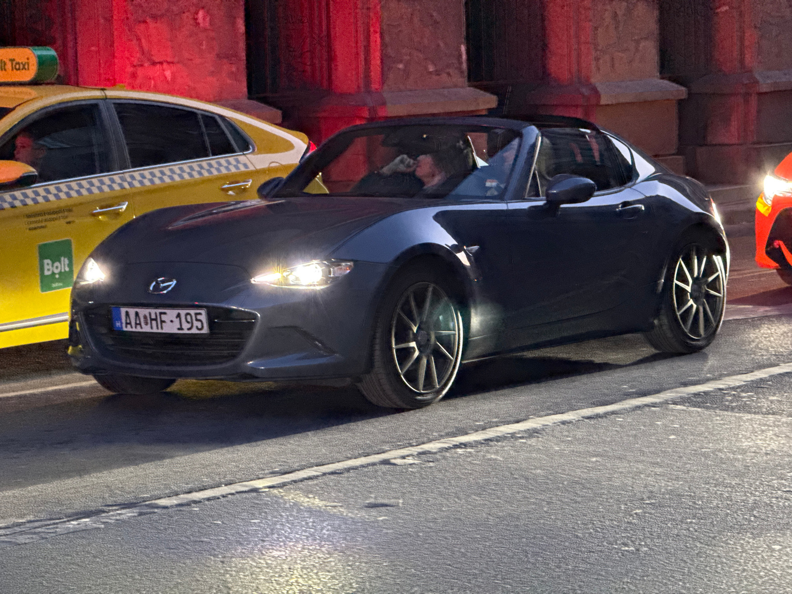 The image shows a gray Mazda MX-5 RF convertible with Hungarian license plate "AA-HF-195" on a city street. The car is partially obscured by a yellow taxi with a "Bolt" logo, and the front end of an o…read more