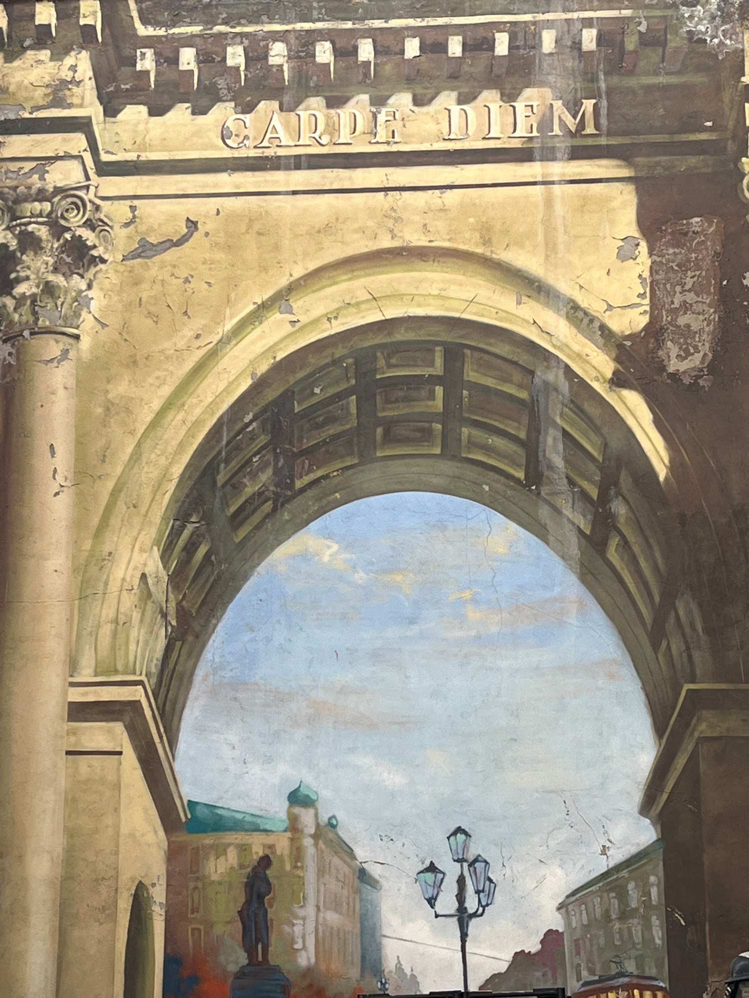 The image depicts a mural or painted scene, likely on a wall, showing an architectural structure with an arched opening. Through the arch, there's a view of a light blue sky with faint clouds, and a b…read more