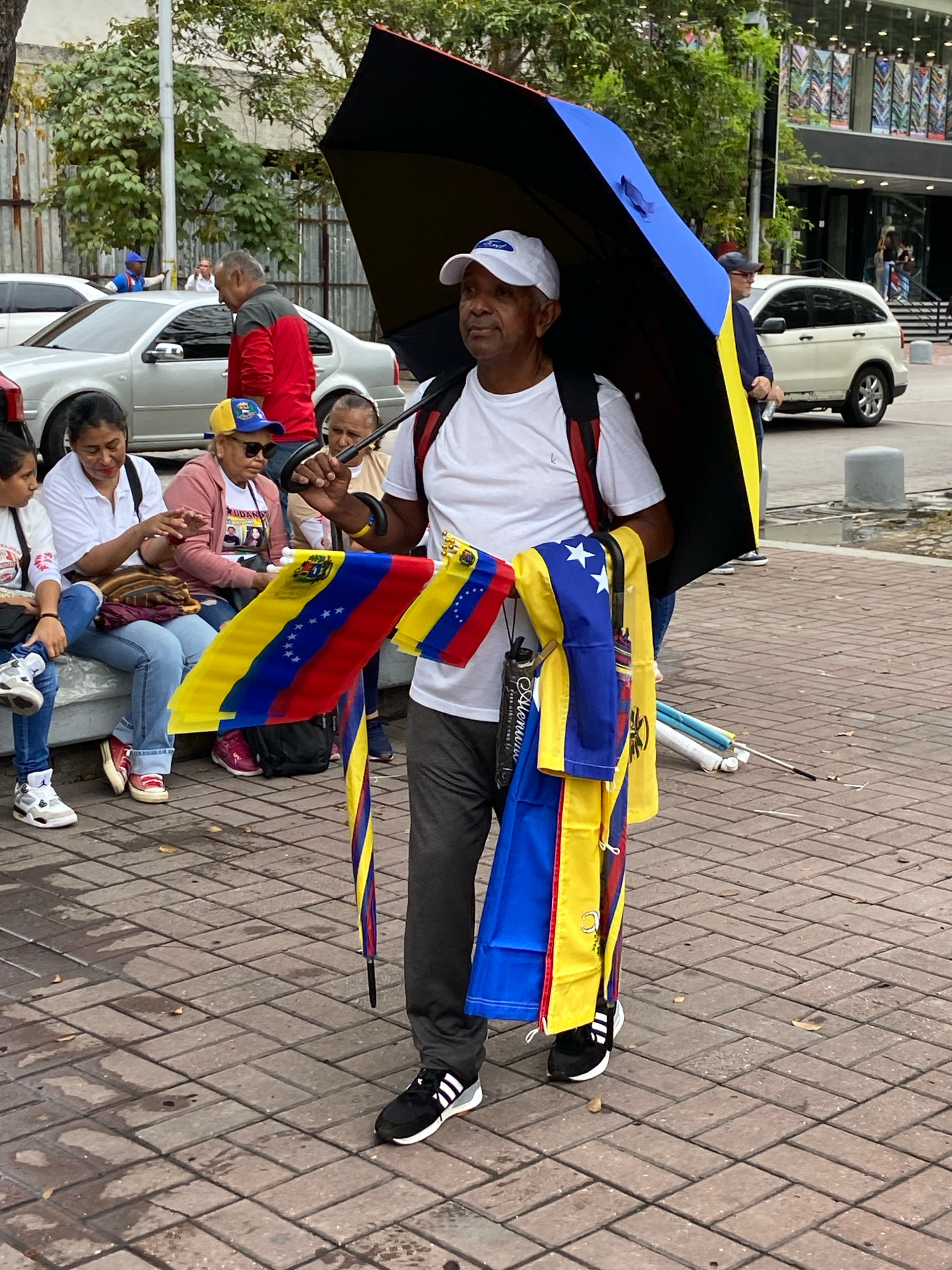 The image depicts a lively daytime street scene in Caracas, Venezuela, centered around a man who appears to be a vendor. He stands on a paved sidewalk, holding a large blue and black umbrella open abo…read more