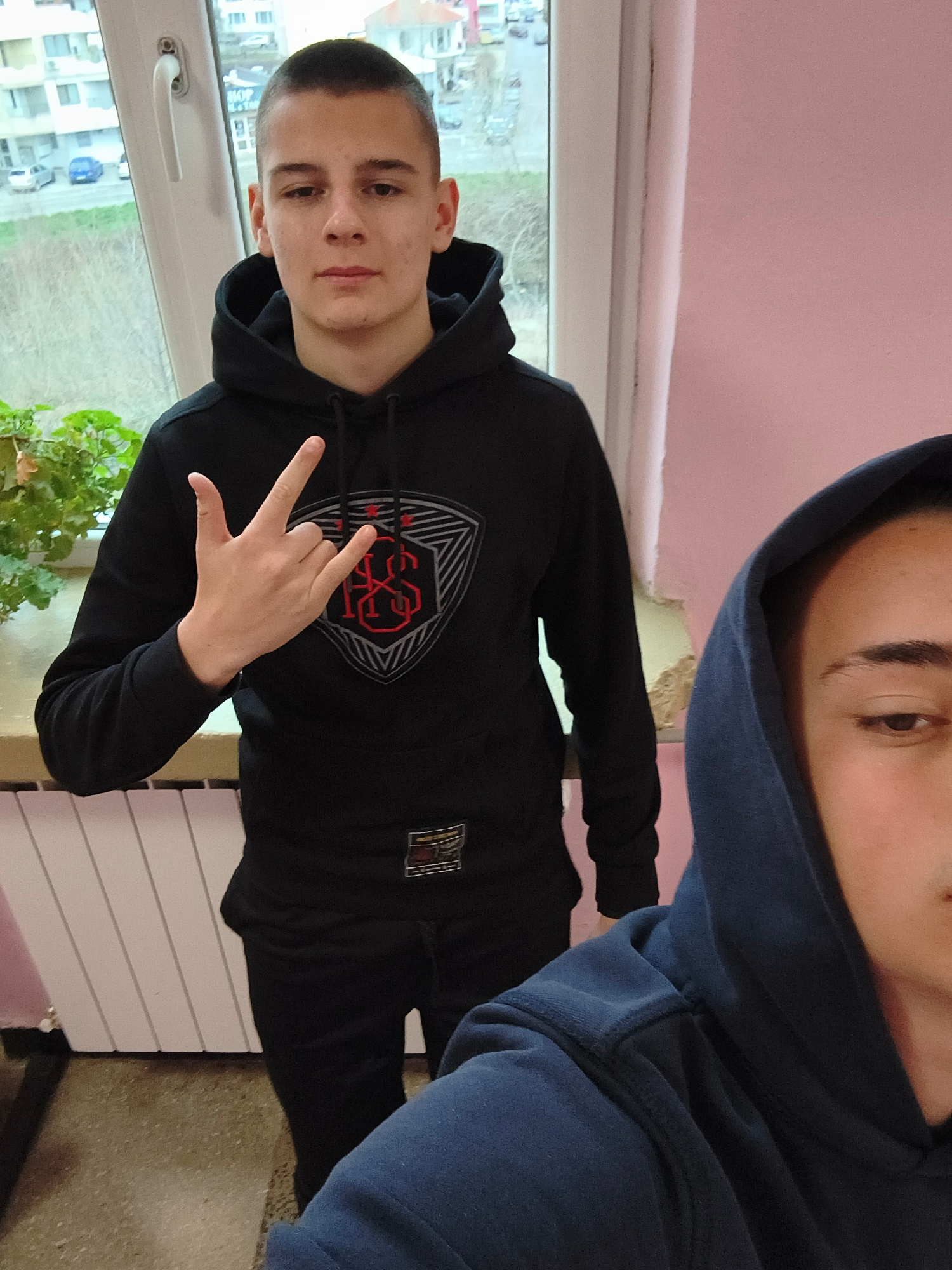 Two people are visible in an indoor setting with a window overlooking a city. One person, likely a young male, is wearing a black hoodie with a graphic design on the chest and is making a hand gesture…read more