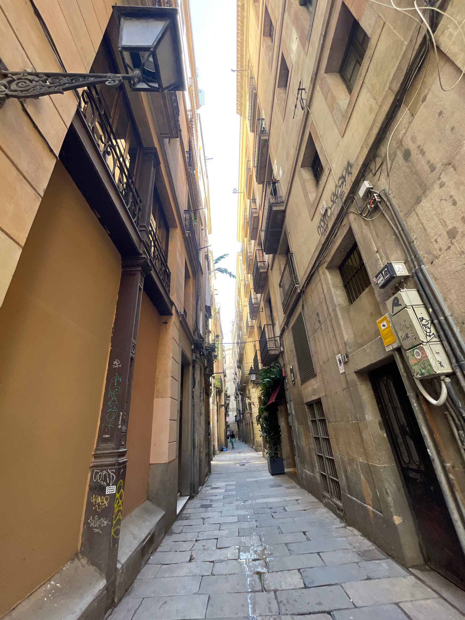 This image captures a very narrow urban alleyway or street in Barcelona, viewed looking dramatically upwards towards the sky. Tall, multi-story buildings flank both sides, creating a deep, canyon-like…read more