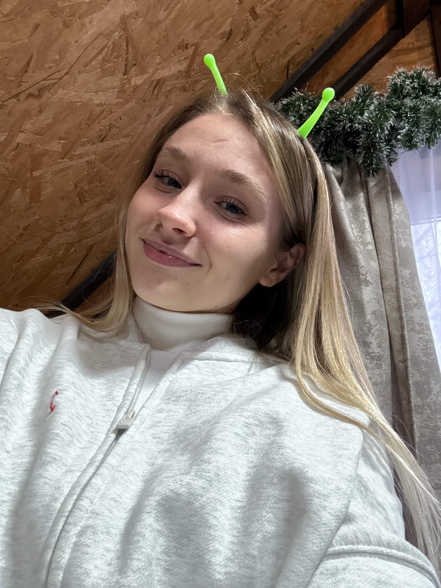 A close-up selfie depicts a young, fair-skinned person with long, blonde hair partially visible, wearing a white zip-up hooded sweatshirt over a white turtleneck. Two green, antennae-like hair clips a…read more