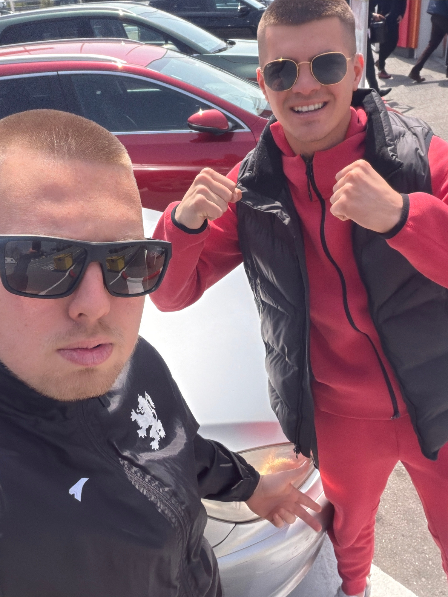 Two men are depicted in an outdoor selfie. The man on the right is wearing a black jacket and black sunglasses. The man on the left is wearing a red tracksuit with a black vest and gold-rimmed sunglas…read more