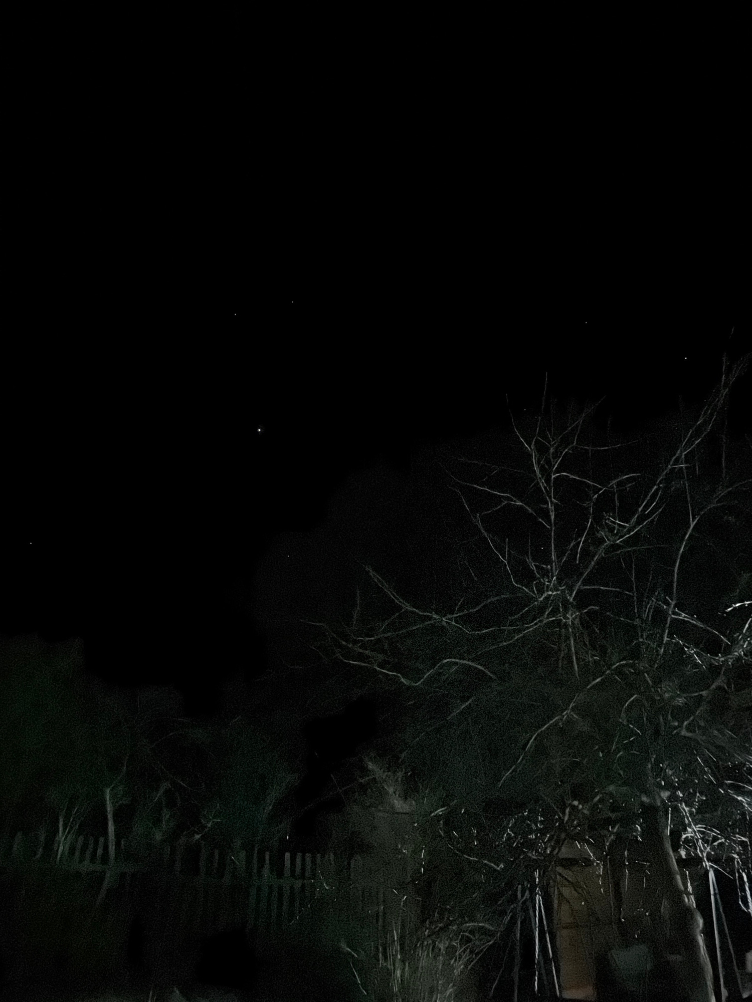 The image captures an extremely dark, low-light scene, likely taken at night in Dubovaya, Russia. The primary subject is a dense network of bare, thin tree or shrub branches, occupying the right sideβ¦read more