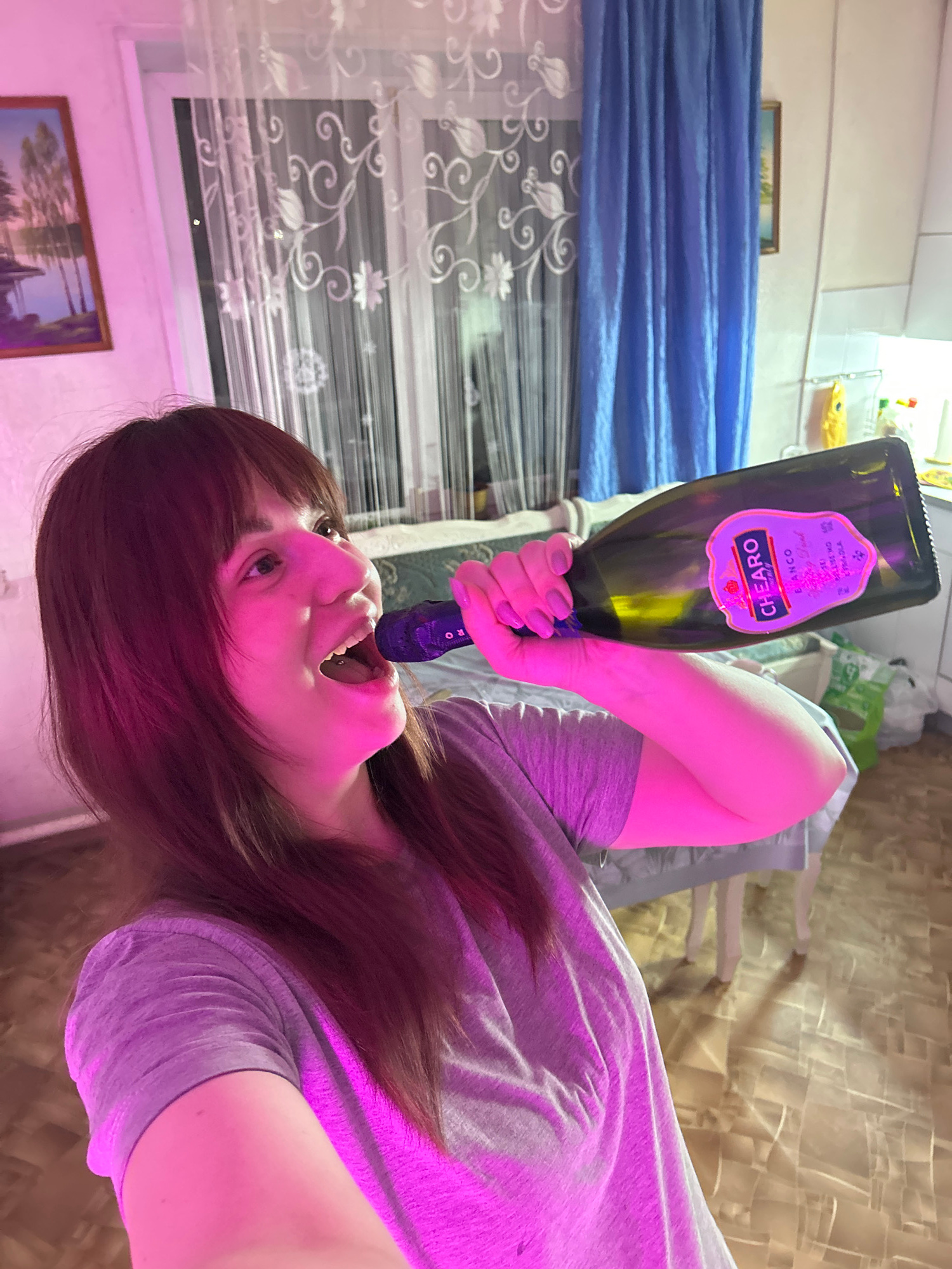 A woman holds a bottle of CHEARO Blanco towards her mouth. She is indoors, in front of a window with patterned blinds and blue curtains. Two framed pictures are visible on the wall. The lighting appea…read more