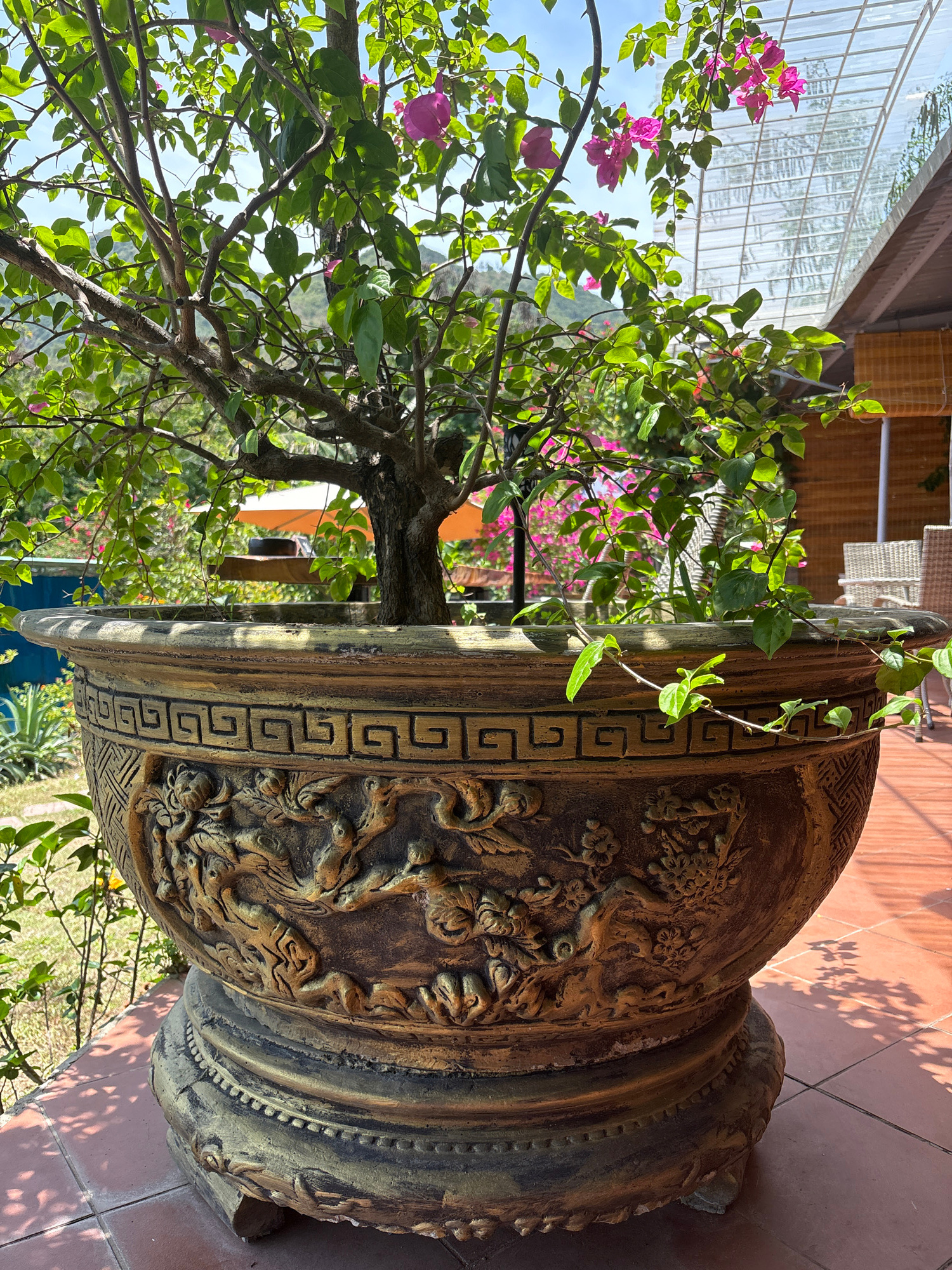 The image shows a large, intricately decorated ceramic pot containing a bougainvillea tree in Nha Trang, Vietnam. The pot is predominantly brown and gold, adorned with bas-relief depictions of figures…read more