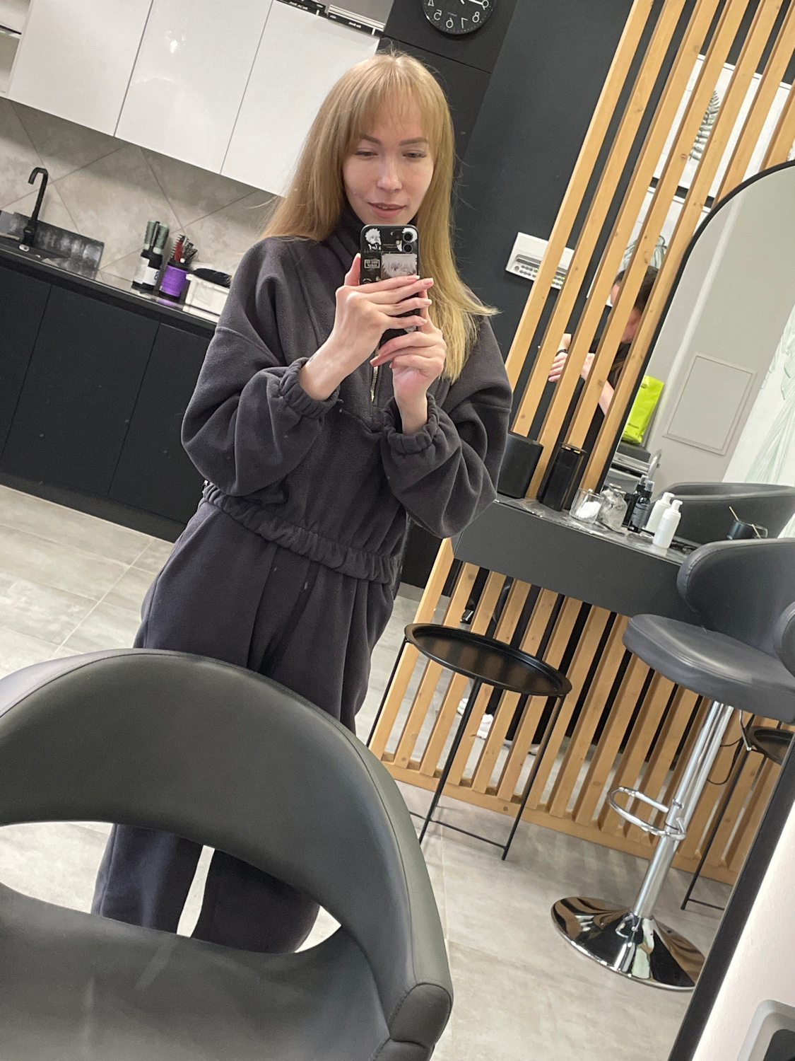 The image, taken with a tilted perspective, shows a young woman capturing a selfie in what appears to be a modern hair salon or beauty studio. She has long, straight blonde hair with bangs and a fair…read more
