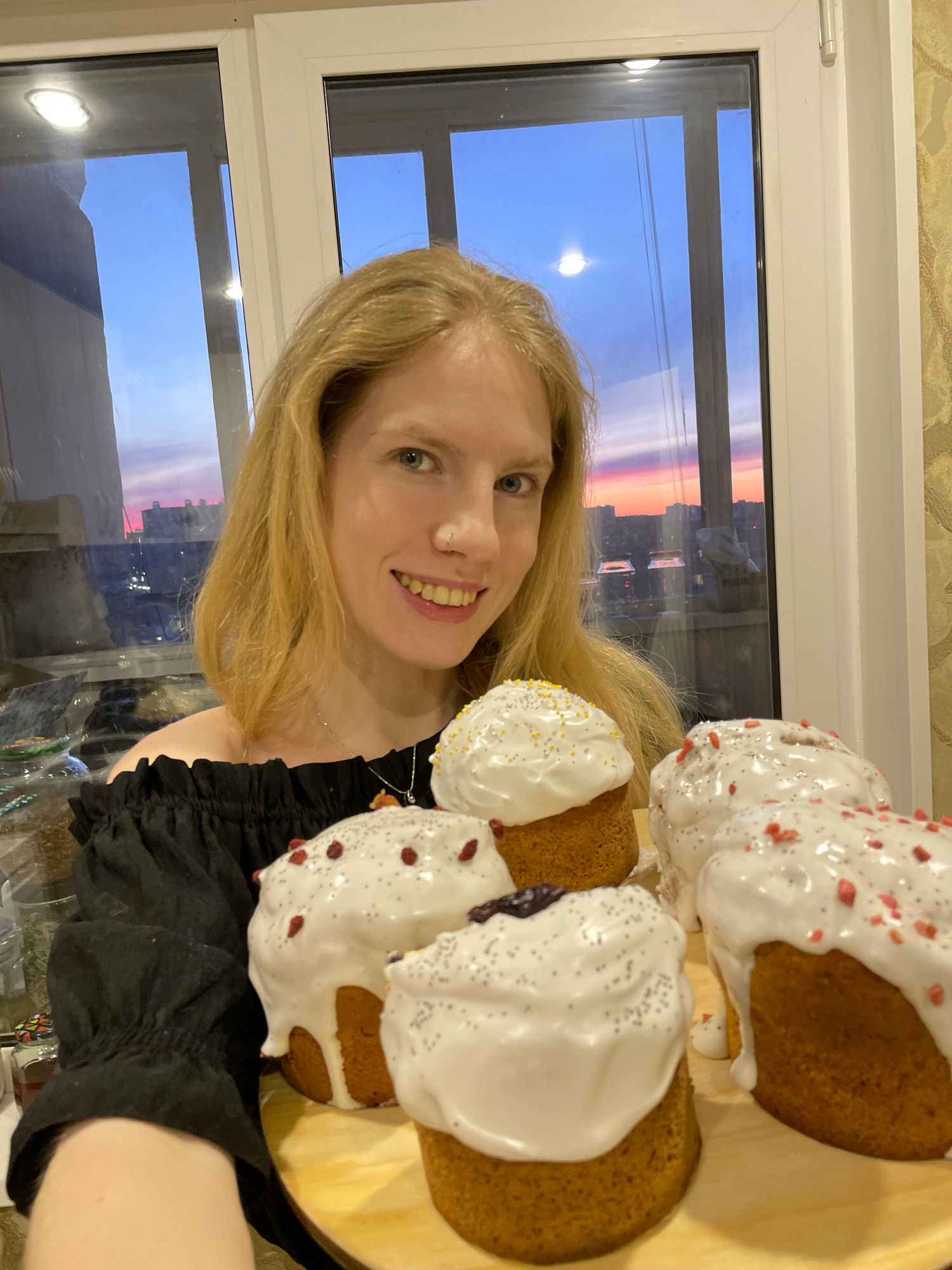 A person with blond hair, wearing a black top, is holding a plate of decorated cakes. The cakes have white icing and various colored sprinkles. The scene is indoors, possibly in an apartment, with a w…read more