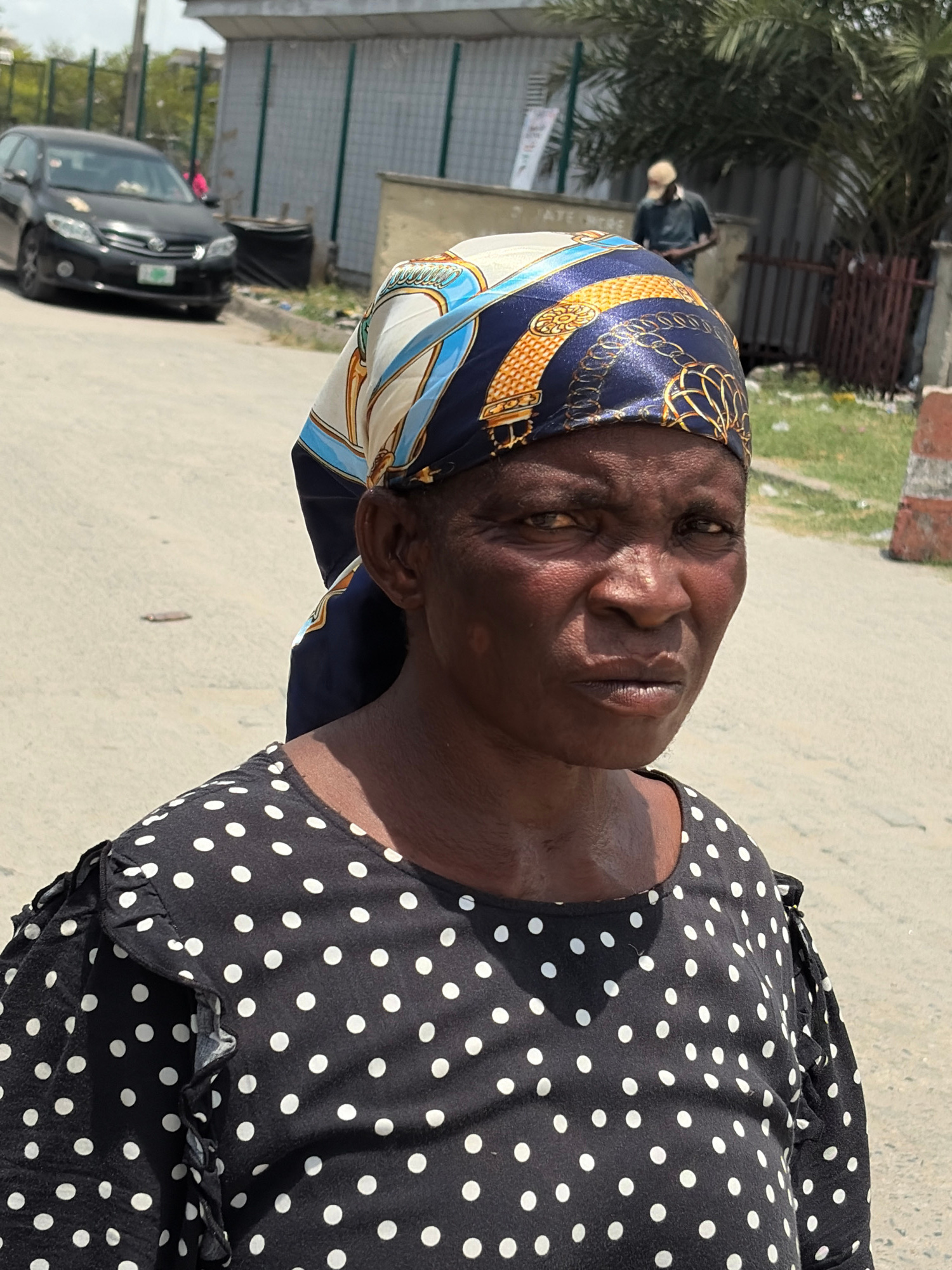 A woman wearing a navy blue and white patterned headscarf and a black and white polka dot dress stands on a concrete surface in Igboefon, Nigeria. A black car and fence are visible in the background.
