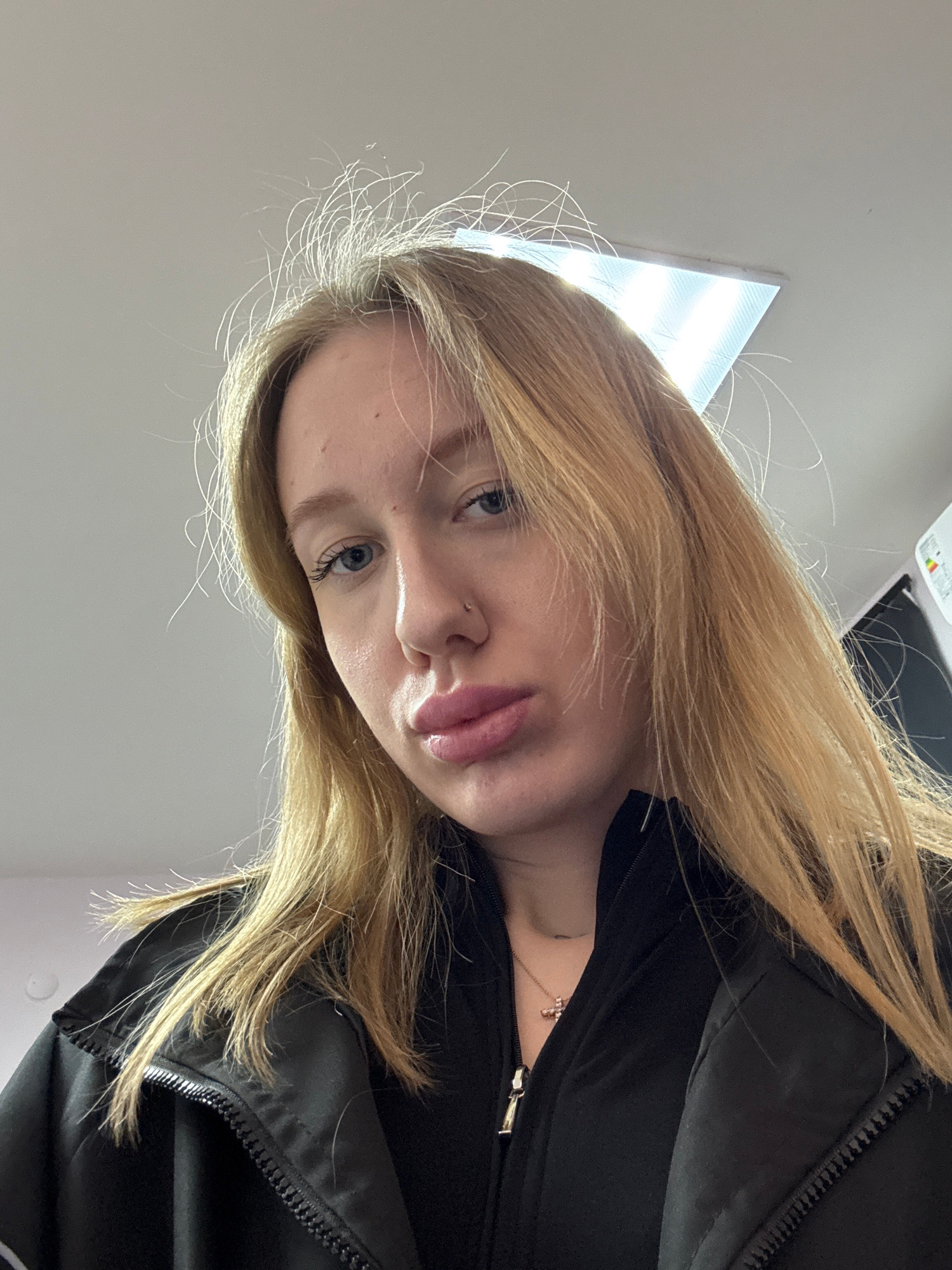 A close-up selfie of a fair-skinned young woman with long, light-blonde hair is positioned against a pale gray wall. The woman is wearing a black hooded jacket, and a gold necklace with a cross pendan…read more