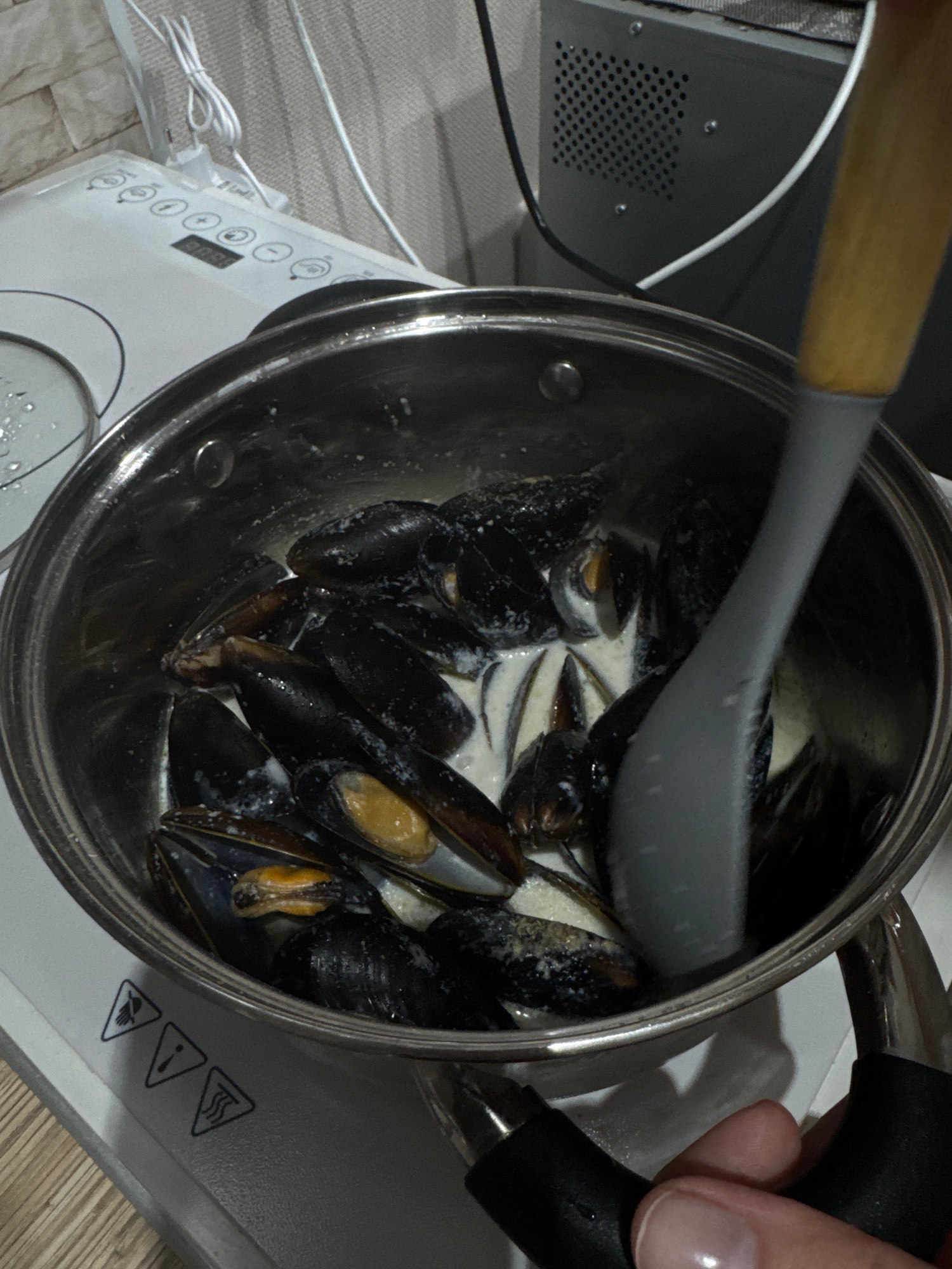 A top-down shot depicts a stainless steel pot filled with cooked mussels in a creamy white sauce. A gray cooking utensil with a wooden handle is stirring the mussels. A hand is holding the pot by one…read more