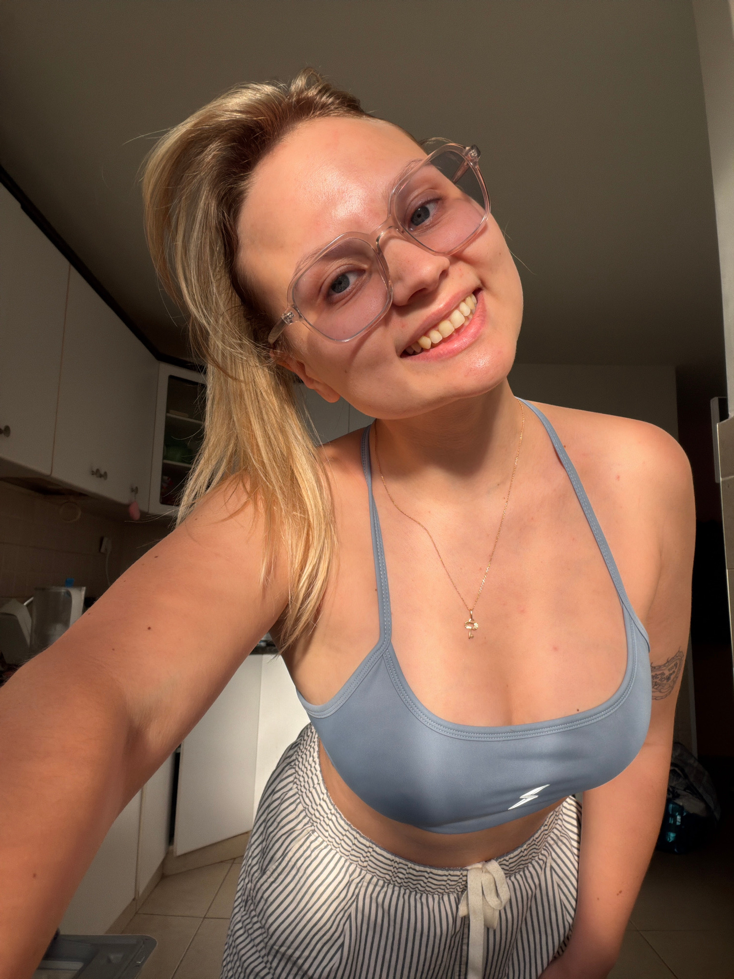 A young Caucasian woman with blonde hair, wearing clear-rimmed glasses, is captured in a rotated selfie. She is smiling broadly, revealing her teeth, and has a cheerful expression. She wears a light b…read more