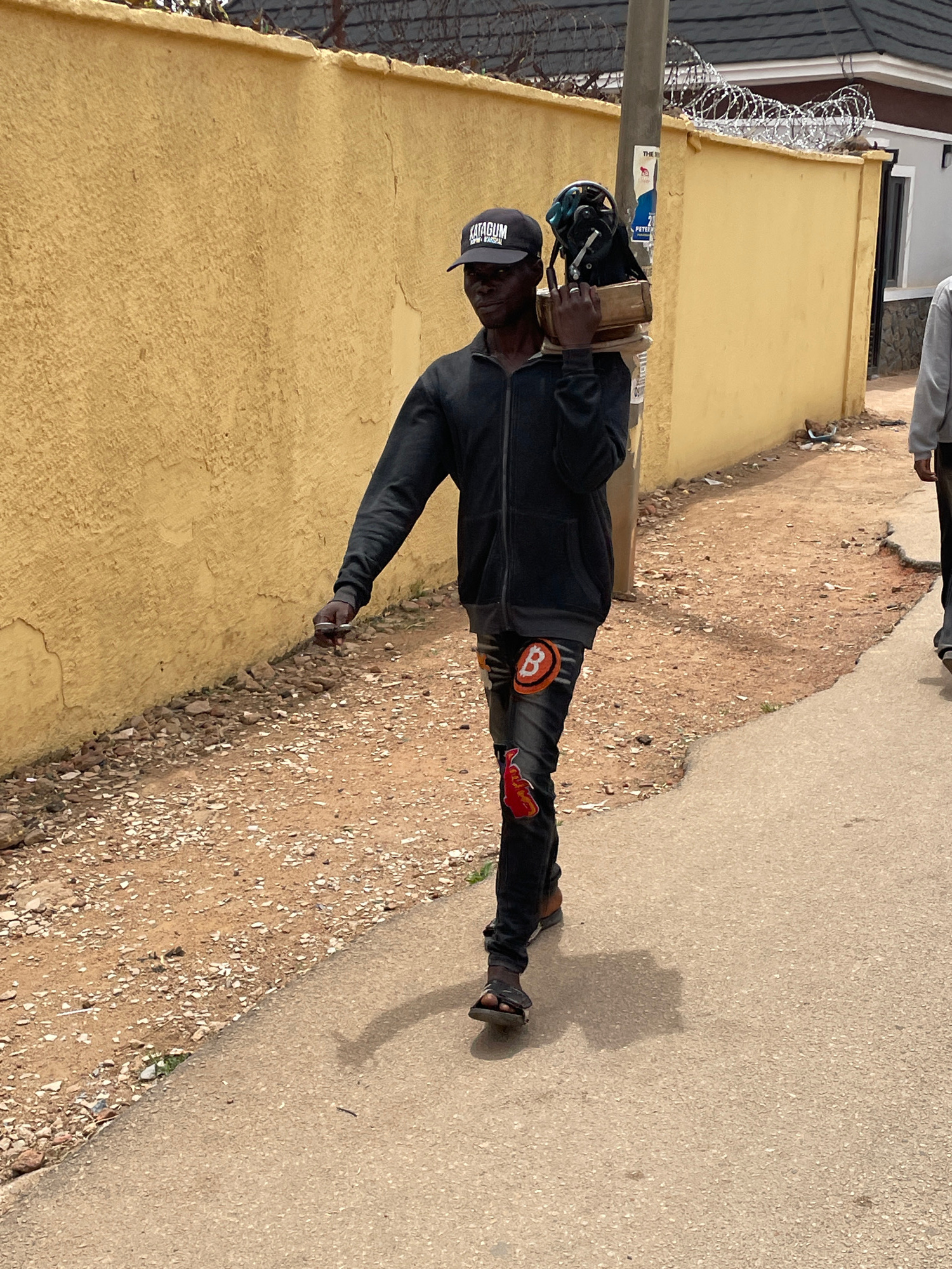 A man wearing a black hoodie, black pants with Bitcoin logos, and a black cap is walking down a street in Jos, Nigeria. He carries equipment on his shoulder. He is walking alongside a yellow wall topp…read more