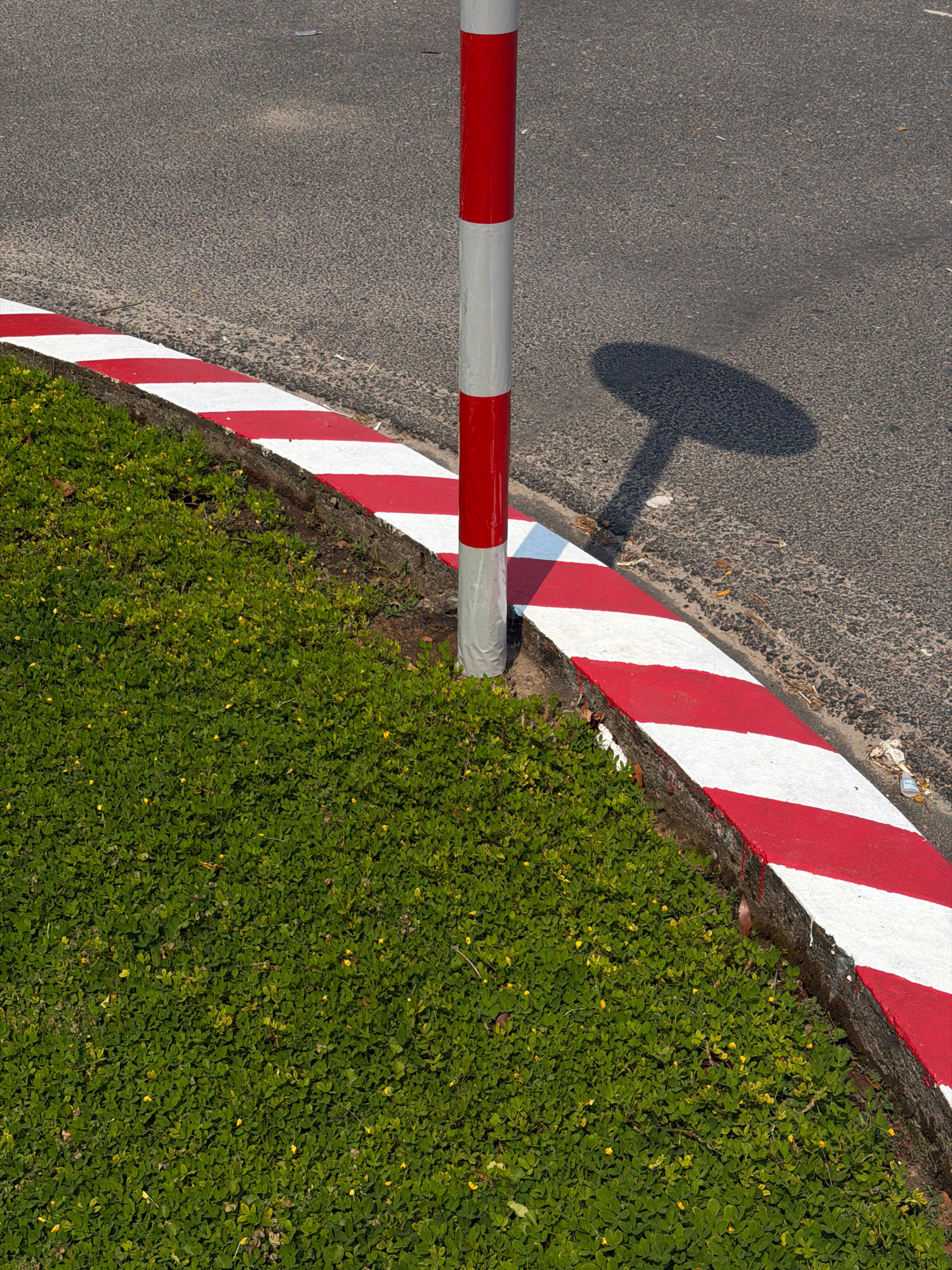 The image is a top-down view of a curved section of road and its border in Đà Nẵng, Vietnam. The road is asphalt and borders a curb painted with alternating red and white stripes. To the right of the…read more