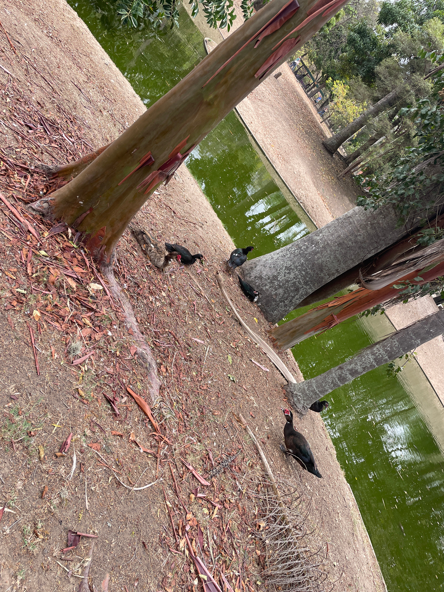 The scene depicts an area within Parque Generalísimo Francisco de Miranda (Parque del Este) in Caracas, Venezuela. The image shows a section of dry, light brown earth covered with fallen reddish-brown…read more