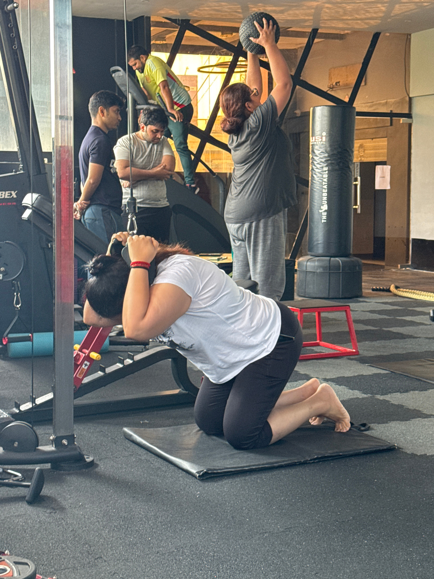 The image shows a group of people in a gym. A woman is performing cable crunches on an exercise machine in the foreground, while a man in the background is doing a medicine ball workout. Other individ…read more