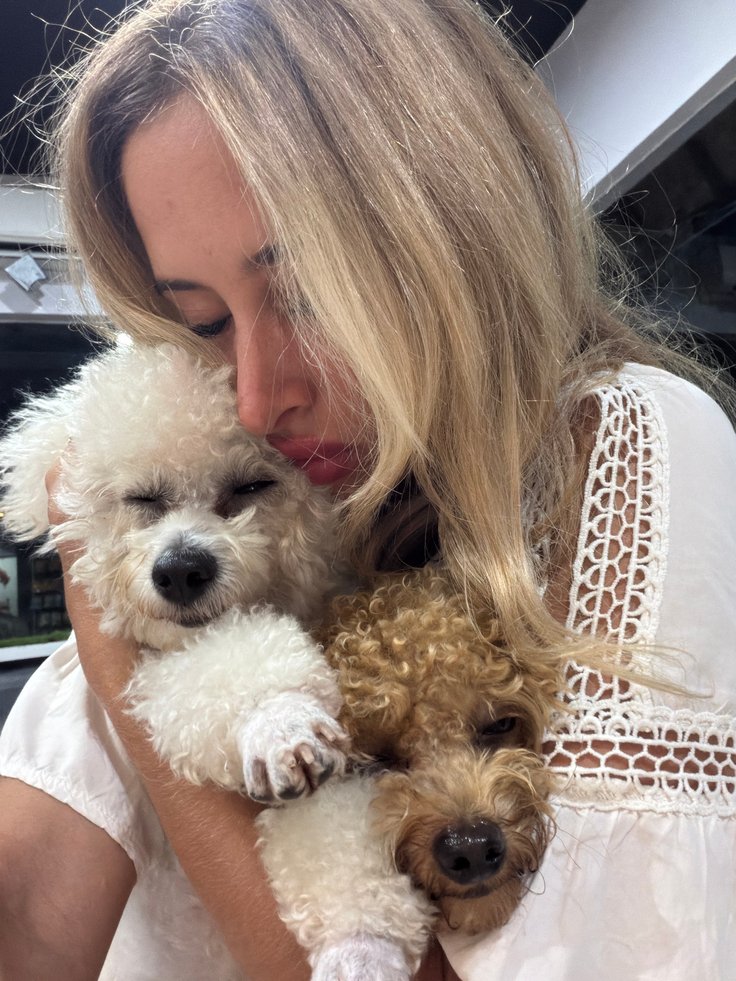 A woman with blonde hair is holding two small dogs in her arms. The dog on top is brown with curly fur, and the dog on the bottom is white with curly fur. The woman is wearing a white dress with a lac…read more