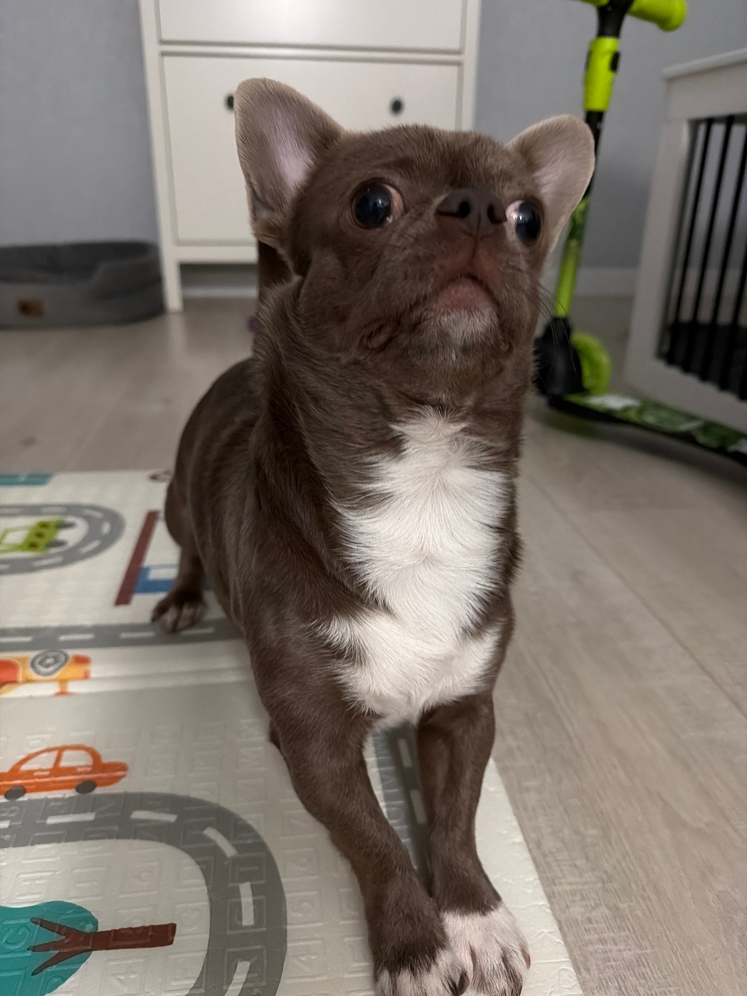A brown and white Chihuahua lies on its stomach on a foam play mat patterned with roads and vehicles. The dog's head is tilted upwards towards the camera. To the left of the dog is a white dresser or…read more