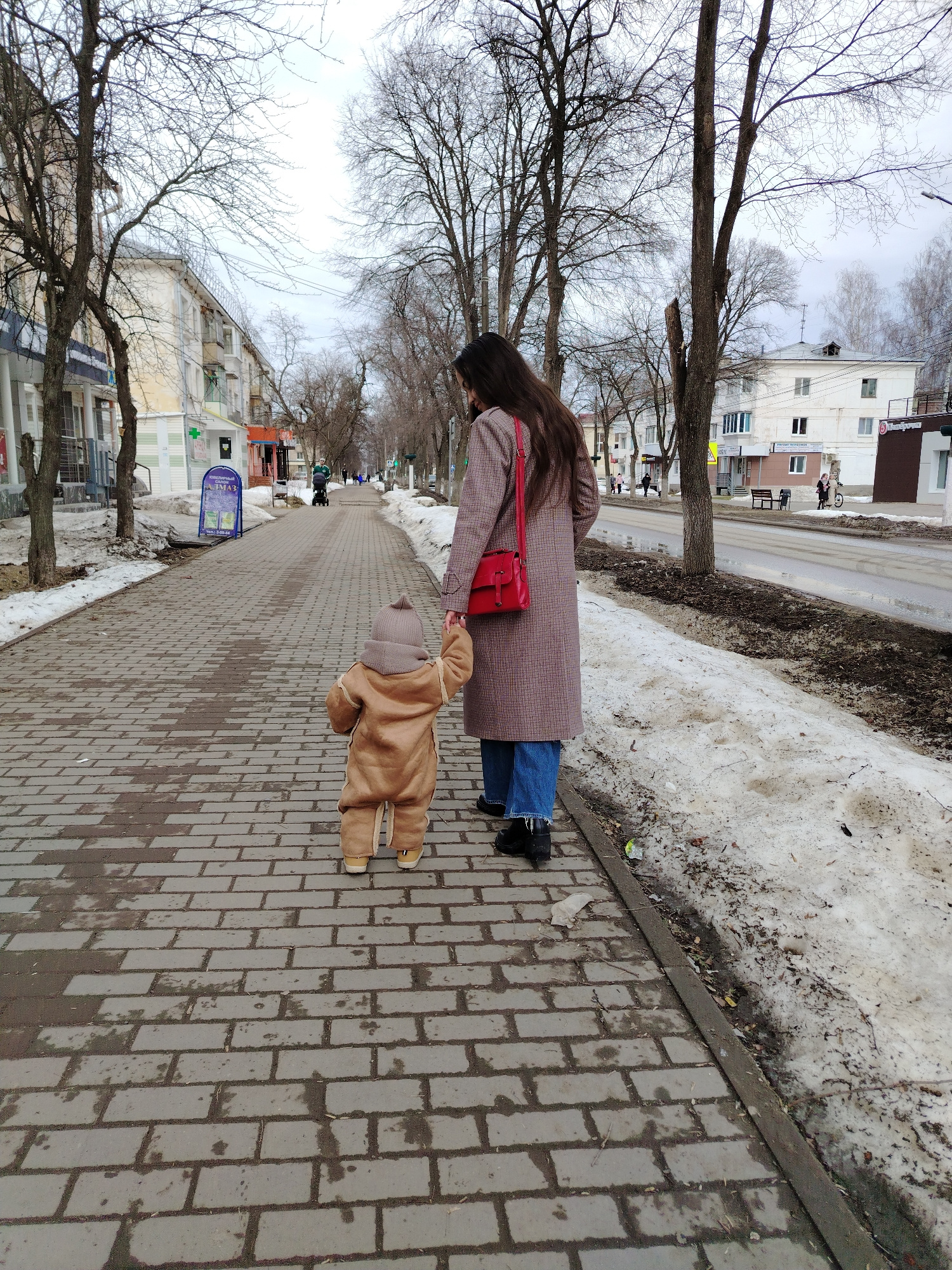 A woman and a toddler are walking away from the viewer on a brick sidewalk in an urban environment. The woman has long, dark hair and wears a long plaid coat, blue jeans, and black boots, with a red pβ¦read more