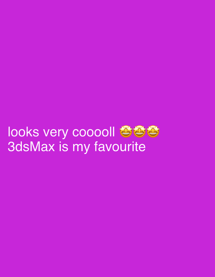 The image is a solid purple background with white text at the bottom left. The text says: "looks very coooooll πŸ€—πŸ€—πŸ€— 3dsMax is my favourite". There is no indication of the location being Milan, Italy…read more
