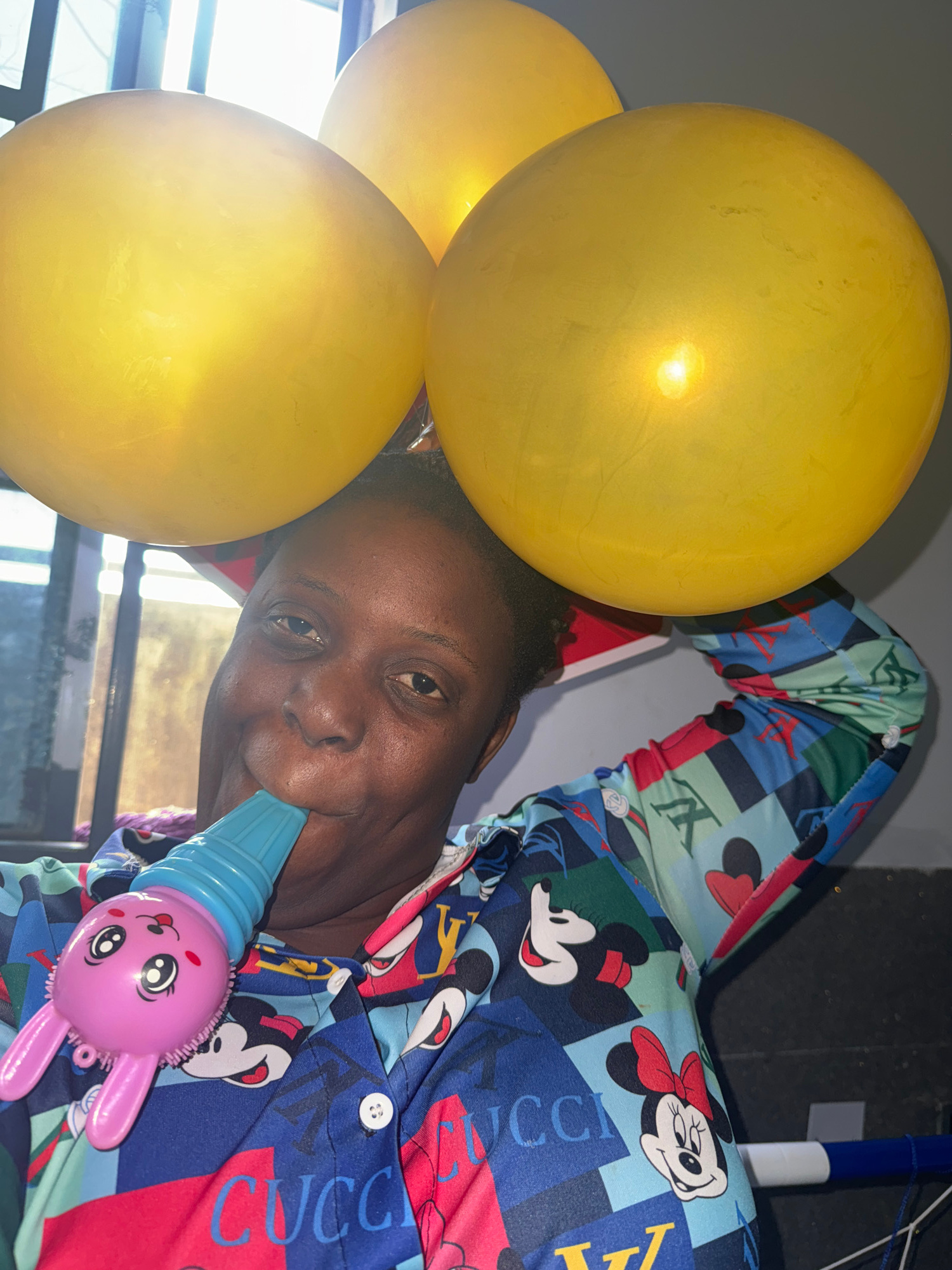 A person with dark hair and dark skin is visible from the shoulders up, holding a pink toy shaped like a bunny in their left hand. They are wearing a colorful shirt with cartoon characters and Gucci l…read more