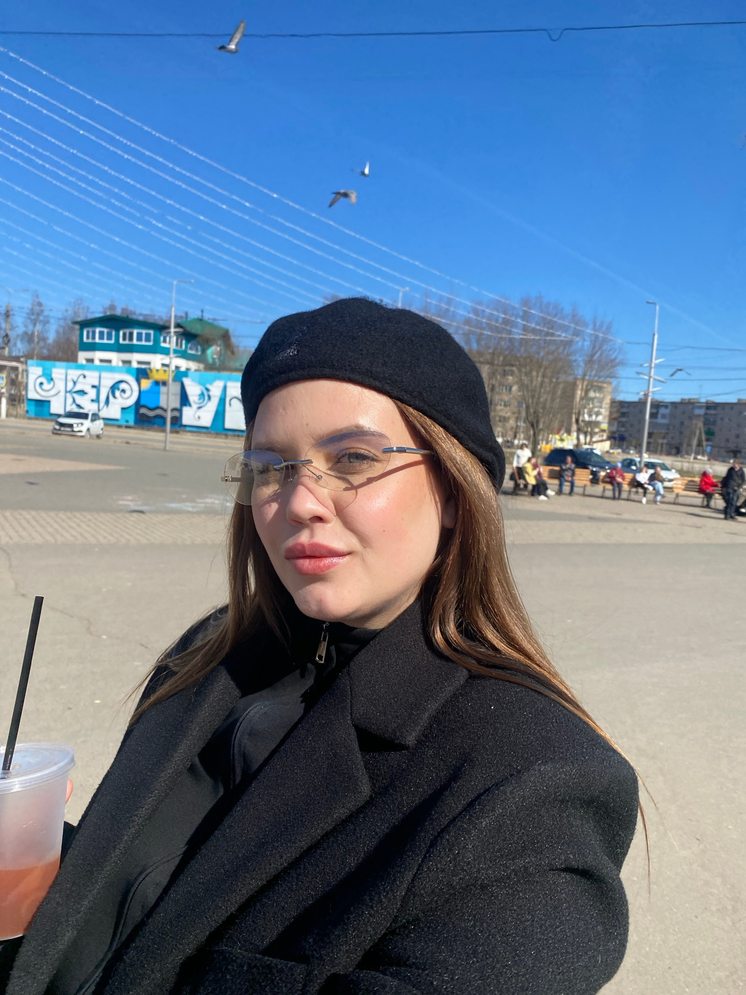 A young woman is depicted in a close-up, outdoors on a bright, sunny day. She has long brown hair, wears a black beret, a black coat, and rimless glasses. She holds a clear plastic cup with a dark str…read more
