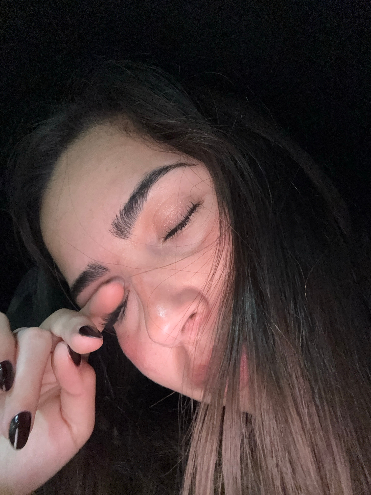 A close-up, tilted image shows a person with their eyes closed and dark brown hair falling across their face. Their skin appears fair. The person's hand is near their face, with dark polished nails vi…read more