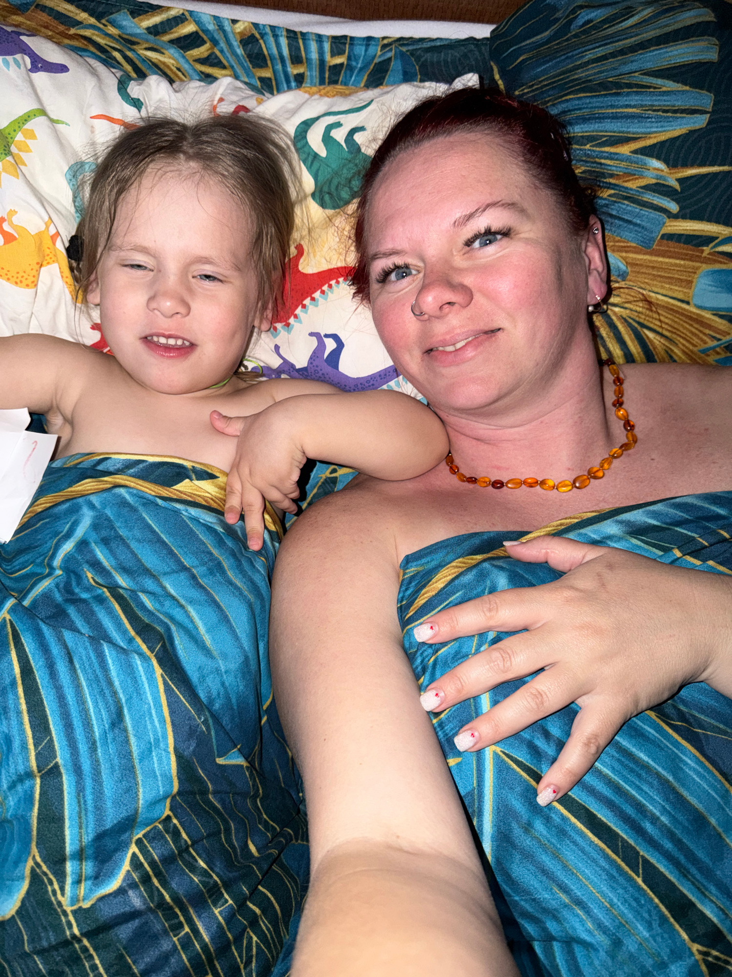 The image depicts an adult woman and a young child lying on a bed. They are both partially covered by a blue and gold patterned blanket. The woman is wearing an amber beaded necklace and has a nose riβ¦read more