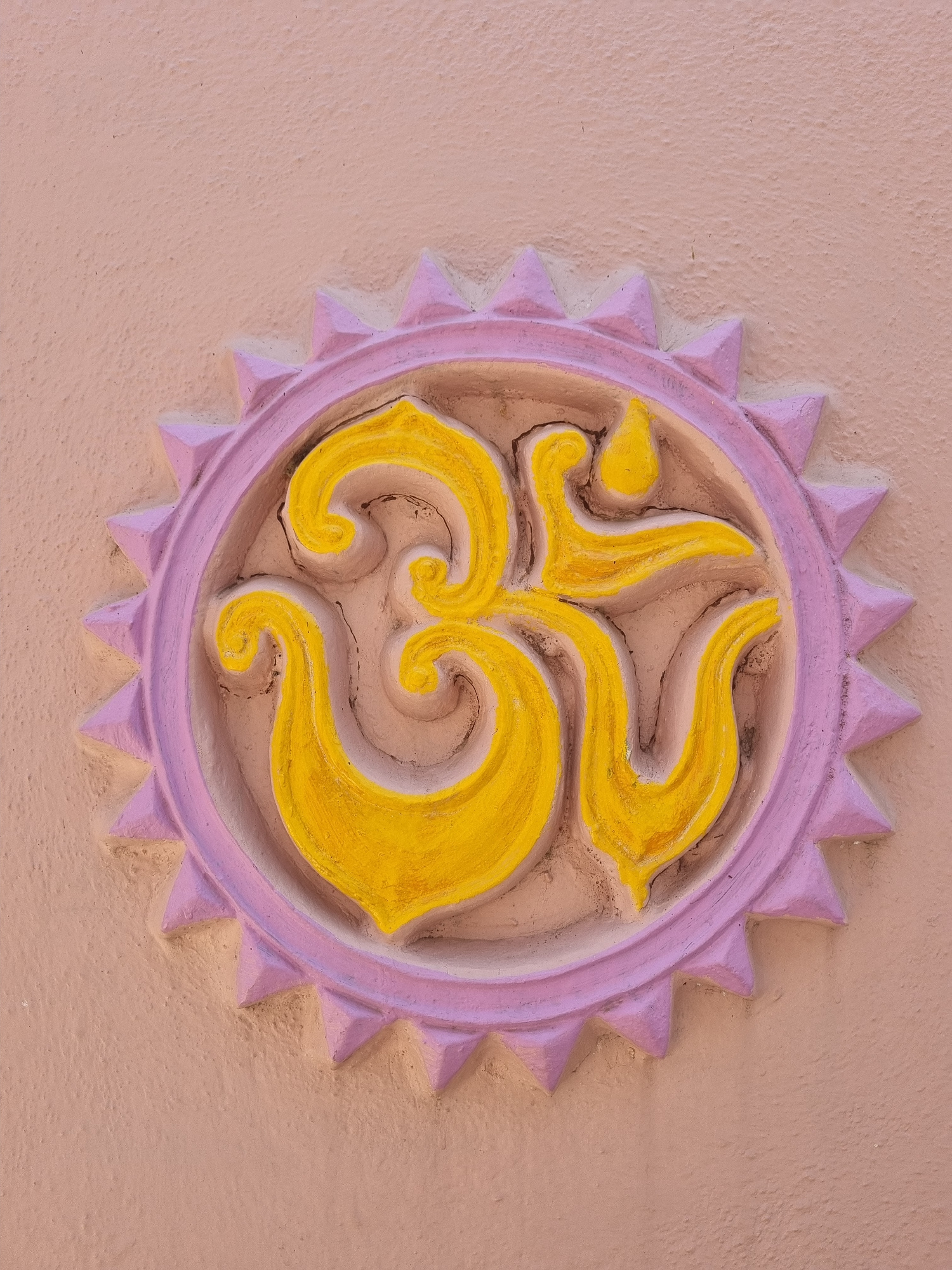 A relief sculpture depicting the Om (Aum) symbol is prominently displayed on a textured wall in Pedda Kammavaripalli, India. The Om symbol is rendered in bright yellow, deeply set within a recessed, l…read more