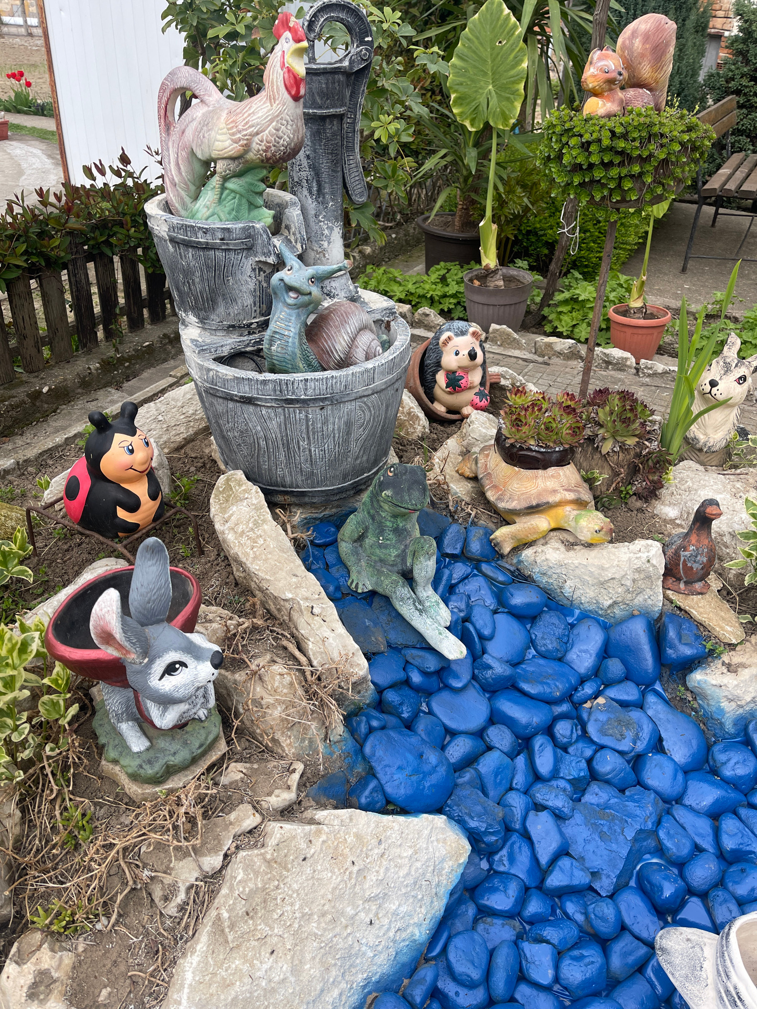 The image depicts a garden scene, likely in Somovit, Bulgaria, featuring a collection of garden ornaments and plants. The focal point is a decorative water feature shaped like a rustic barrel, overfloβ¦read more