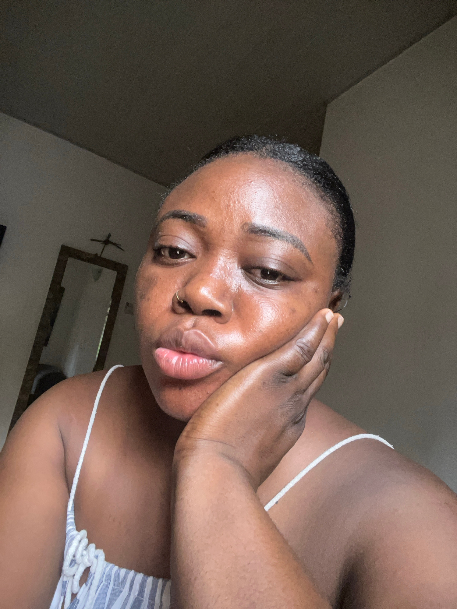 A medium-close-up shot, taken in the city of Abuja, Nigeria, shows a dark-skinned woman in a striped camisole. She faces forward, with her head tilted downward and to the left. Her left hand is cupped…read more
