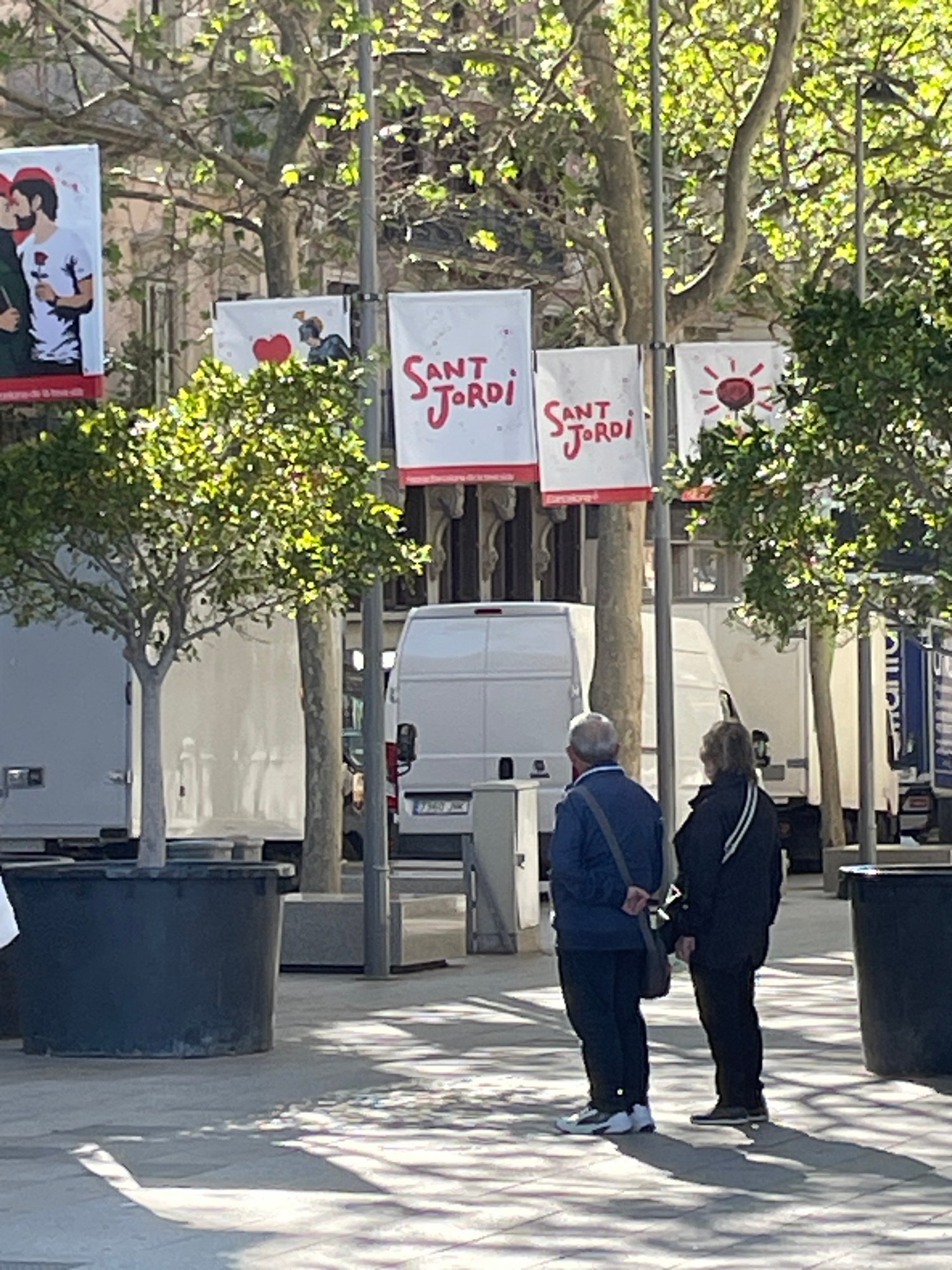 The image depicts a street scene in Barcelona, Spain. Banners advertising "Sant Jordi" are visible, suggesting the photograph was taken around April 23rd. Two people are walking on the sidewalk, and t…read more
