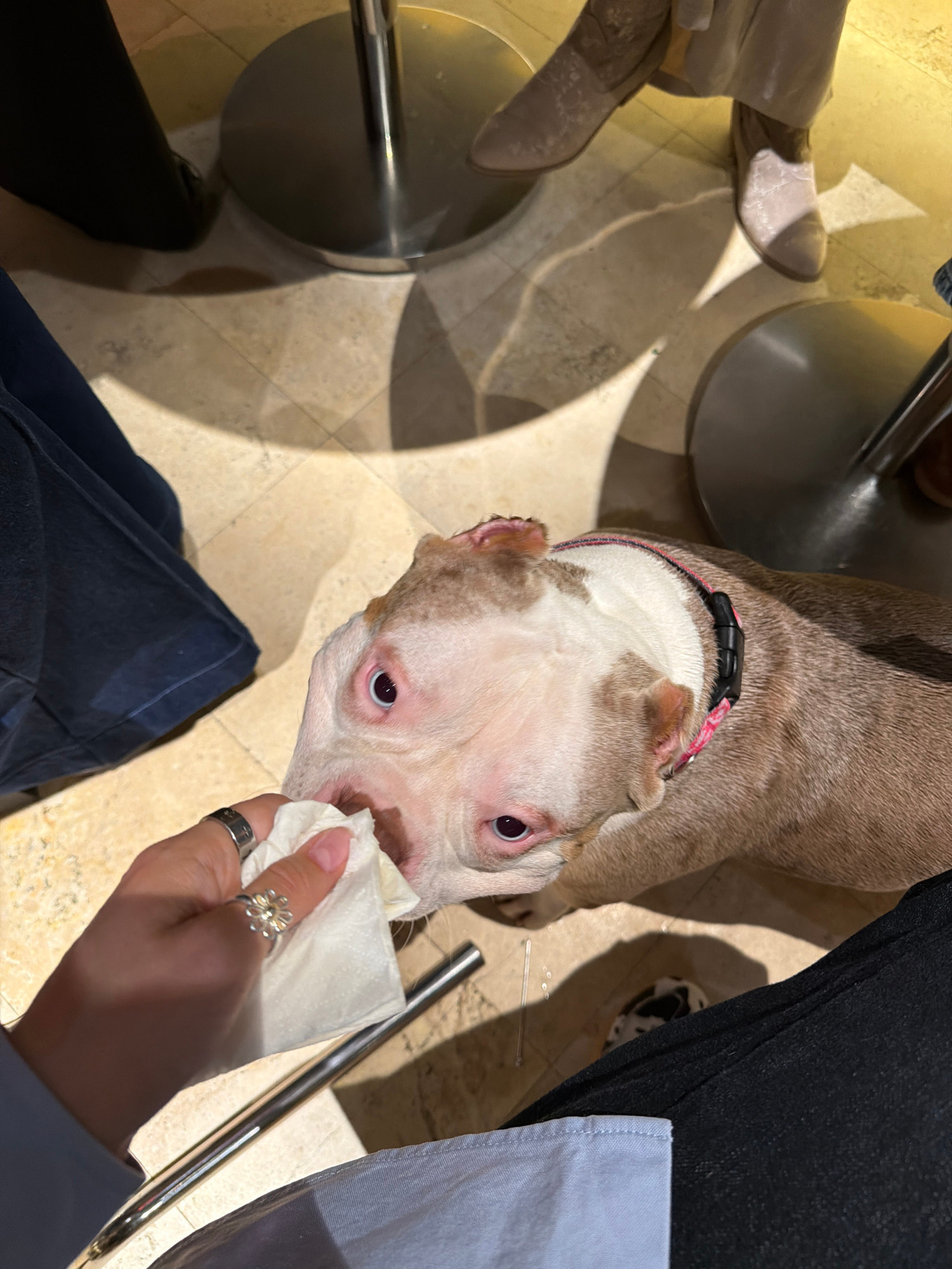 The scene is an indoor setting with a tiled floor and multiple chairs with metal bases. A dog with a pink collar is the focal point, its head turned towards a hand holding a white tissue. The person h…read more