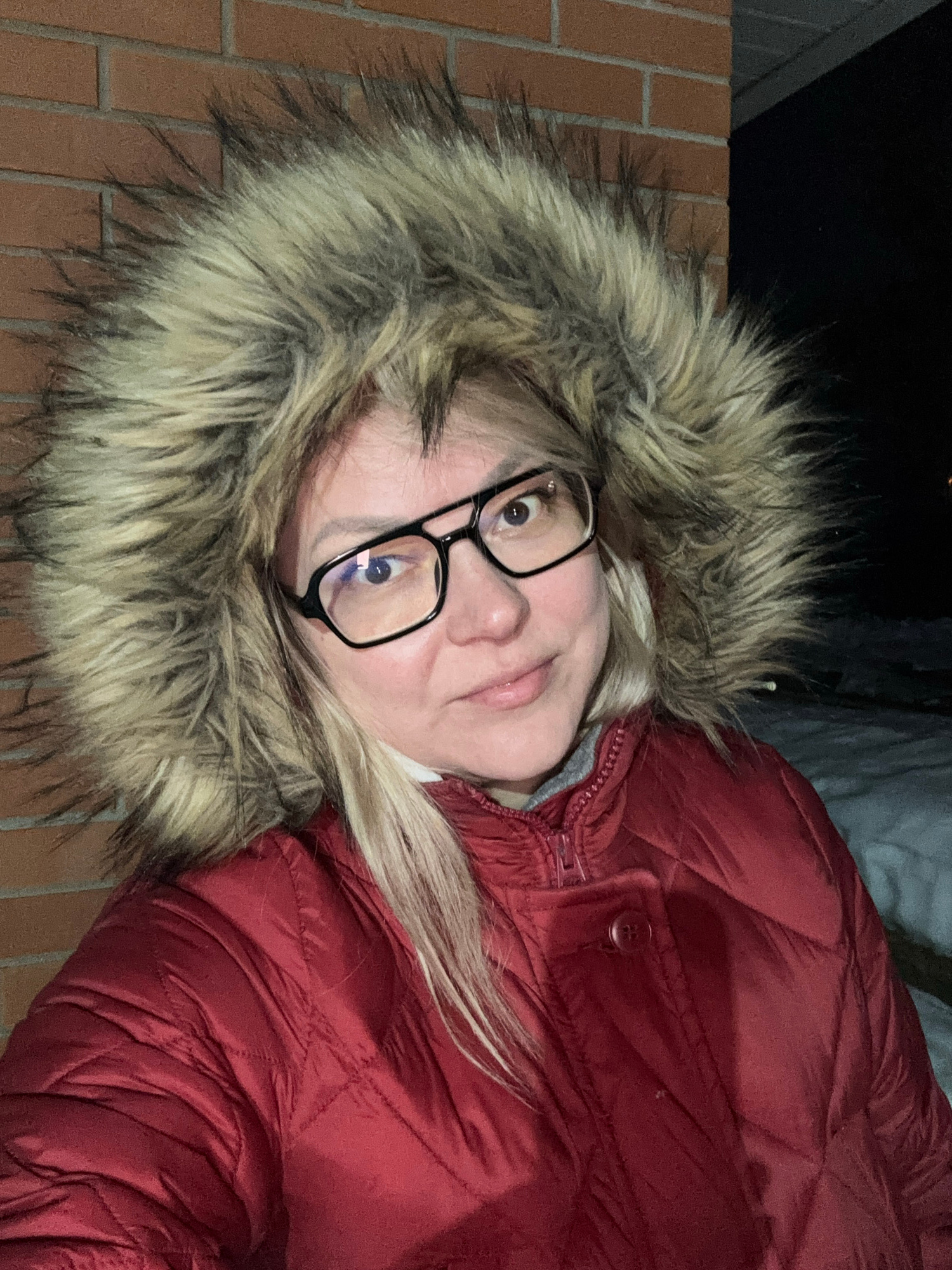 A close-up, chest-up portrait of an adult female in Русский Вожой, Russia, captured outdoors at night. The subject has fair skin, light blonde hair partially visible beneath a prominent, multi-toned l…read more