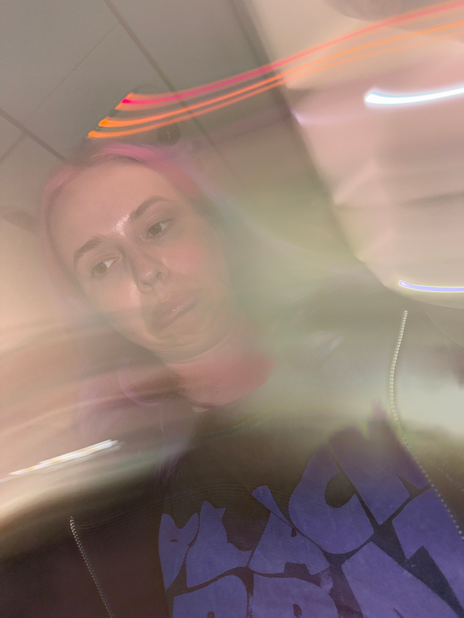 The image is an out-of-focus selfie of a person with pink hair, wearing a dark jacket with large, light-colored lettering, likely taken in City of Zagreb, Croatia. The person is looking directly at th…read more